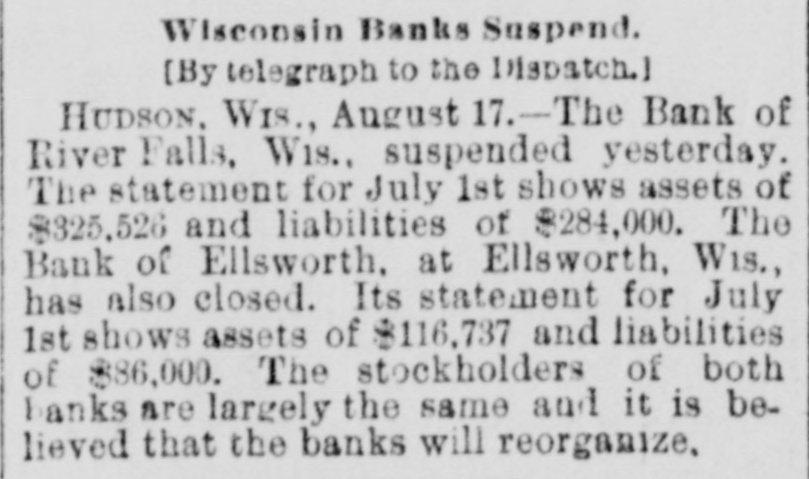 Wisconsin Banks Suspend. [By telegraph to the Dispatch.] HUDSON, WIS., August 17.-The Bank of River Falls, Wis., suspended yesterday. The statement for July 1st shows assets of $325,526 and liabilities of $284,000. The Bank of Ellsworth. at Ellsworth, Wis., has also closed. Its statement for July 1st shows assets of $116,737 and liabilities of $86,000. The stockholders of both banks are largely the same and it is believed that the banks will reorganize,
