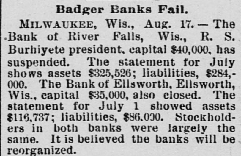 Badger Banks Fail. MILWAUKEE, Wis., Aug. 17. - The Bank of River Falls, Wis., R. S. Burhiyete president, capital $40,000, has suspended. The statement for July shows assets $325,526; liabilities, $284,000. The Bank of Ellsworth, Ellsworth, Wis., capital $35,000, also closed. The statement for July 1 showed assets $116,737; liabilities, $86,000. Stockholders in both banks were largely the same. It is believed the banks will be reorganized.
