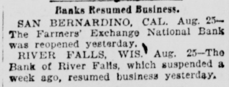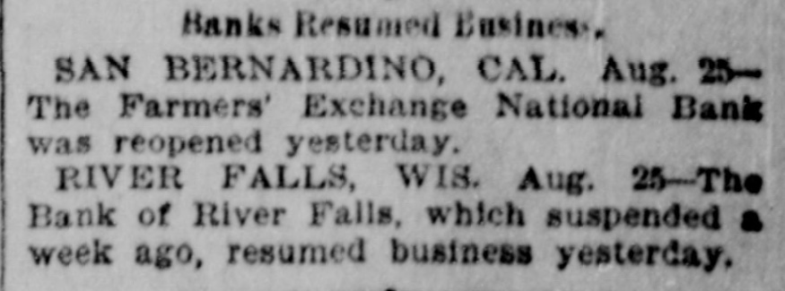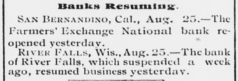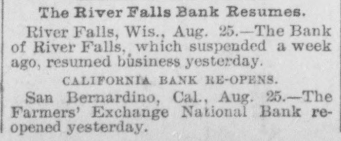 Banks Resumed Business. SAN BERNARDINO, CAL. Aug. 25The Farmers' Exchange National Bank was reopened yesterday. RIVER FALLS, WIS. Aug. 25-The Bank of River Falls, which suspended a week ago, resumed business yesterday.