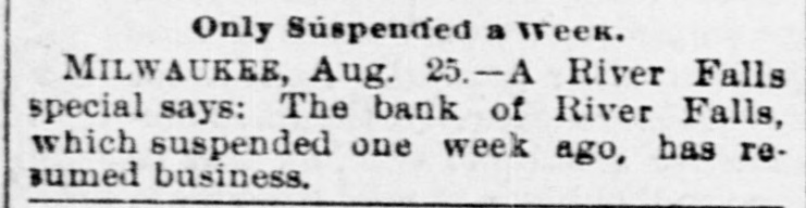 Only Suspended a Week. MILWAUKEE, Aug. 25.-A River Falls special says: The bank of River Falls, which suspended one week ago, has resumed business.