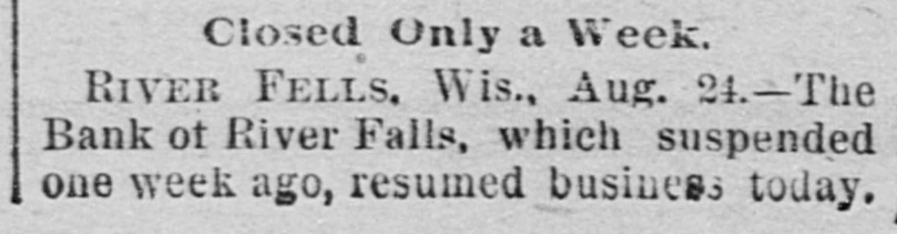 Our Banks All Right. The report that the Hudson Savings Bank closed its doors on Friday of last week, caused some alarm among the depositors of the Bank of River Falls, and many of them withdrew their deposits on Saturday morning. There was not the slightest reason for this alarm, as the Bank of River Falls has at all times done a prosperous business and has been exceedingly cautious in making its loans. This is to its credit and a guarantee of soundness to its stockholders and depositors. It is safe to say that the deposits in the bank were as safe on Saturday as they have been on any day during the nineteen years of its existence. But the feeling of uncertainty as to the future now pervading the whole country, together with the closing of the Hudson bank was too much to withstand by persons otherwise cool and considerate in their business affairs. The business men of the city stood by the bank to a man. Not one withdrew his deposits. On the contrary they made deposits during the day to aid the bank to weather out the storm. It is unnecessary to say that even if the alarmists had succeeded in closing the doors of the bank, they would only have delayed the payment of their certificates until such time as the bank could make collections. As it was the bank netted some $400 in interest which depositors in their madness threw away. Four hundred dollars net earnings in one day is pretty good for a country bank. A slight run was also made on the Farmers & Merchants Bank, but that institution is young, has consequently fewer deposits, and the stacks of money in sight soon reassured the nervous ones among the depositors. It is greatly to the credit of our money institutions that they successfully outrode the storm and that they assisted each other in the most friendly and substantial manner.