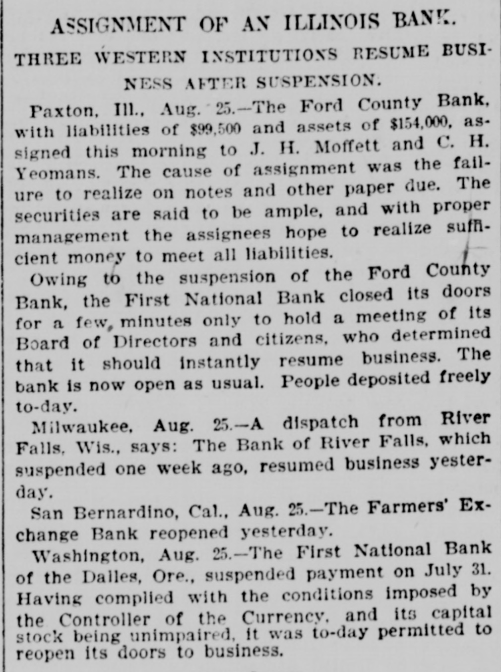 ASSIGNMENT OF AN ILLINOIS BANK. THREE WESTERN INSTITUTIONS RESUME BUSINESS AFTER SUSPENSION. Paxton, Ill., Aug. 25.-The Ford County Bank, with liabilities of $99,500 and assets of $154,000, assigned this morning to J. H. Moffett and C. H. Yeomans. The cause of assignment was the failure to realize on notes and other paper due. The securities are said to be ample, and with proper management the assignees hope to realize sufficient money to meet all liabilities. Owing to the suspension of the Ford County Bank, the First National Bank closed its doors for a few, minutes only to hold a meeting of its Board of Directors and citizens, who determined that it should instantly resume business. The bank is now open as usual. People deposited freely to-day. Milwaukee, Aug. 25.-A dispatch from River Falls, Wis., says: The Bank of River Falls, which suspended one week ago, resumed business yesterday. San Bernardino, Cal., Aug. 25.-The Farmers' Exchange Bank reopened yesterday. Washington, Aug. 25.-The First National Bank of the Dalles, Ore., suspended payment on July 31. Having complied with the conditions imposed by the Controller of the Currency, and its capital stock being unimpaired, it was to-day permitted to reopen its doors to business.