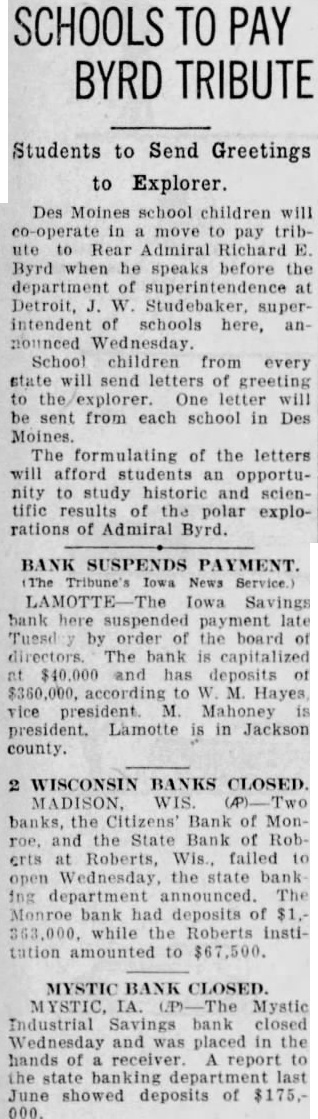 SCHOOLS TO PAY BYRD TRIBUTE Students to Send Greetings to Explorer. Des Moines school children will co-operate in a move to pay tribute to Rear Admiral Richard E. Byrd when he speaks before the department of superintendence at Detroit, J. W. Studebaker, superintendent of schools here, announced Wednesday. School children from every state will send letters of greeting to the/explorer. One letter will be sent from each school in Des Moines. The formulating of the letters will afford students an opportunity to study historic and scientific results of the polar explorations of Admiral Byrd. BANK SUSPENDS PAYMENT. The Tribune's Iowa News Service.) LAMOTTE-The Iowa Savings bank here suspended payment late Tuesd by order of the board of directors The bank is capitalized nt $40.000 and has deposits of $360,000. according to W M. Hayes vice president M Mahoney is president. Lamotte is in Jackson county. 2 WISCONSIN BANKS CLOSED. banks, the Citizens' Bank of Monroe. and the State Bank of Robcrts at Roberts, Wis. failed to open Wednesday, the state bank ing department announced. The Monroe bank had deposits of $1.363,000. while the Roberts institation amounted to $67,500. MYSTIC BANK CLOSED. MYSTIC. IA. (P)-The Mystic Industrial Savings bank closed Wednesday and was placed in the hands of receiver report to the state banking department last June showed deposits of $175,000.
