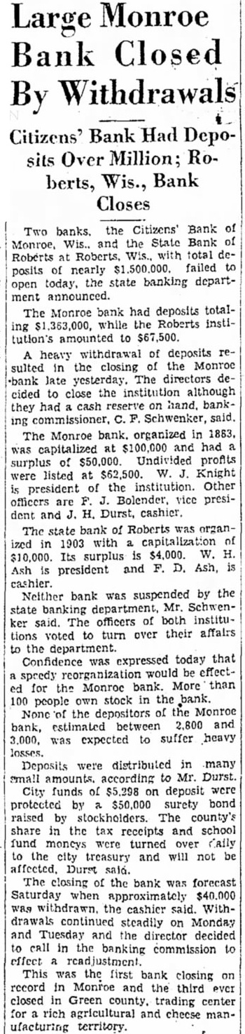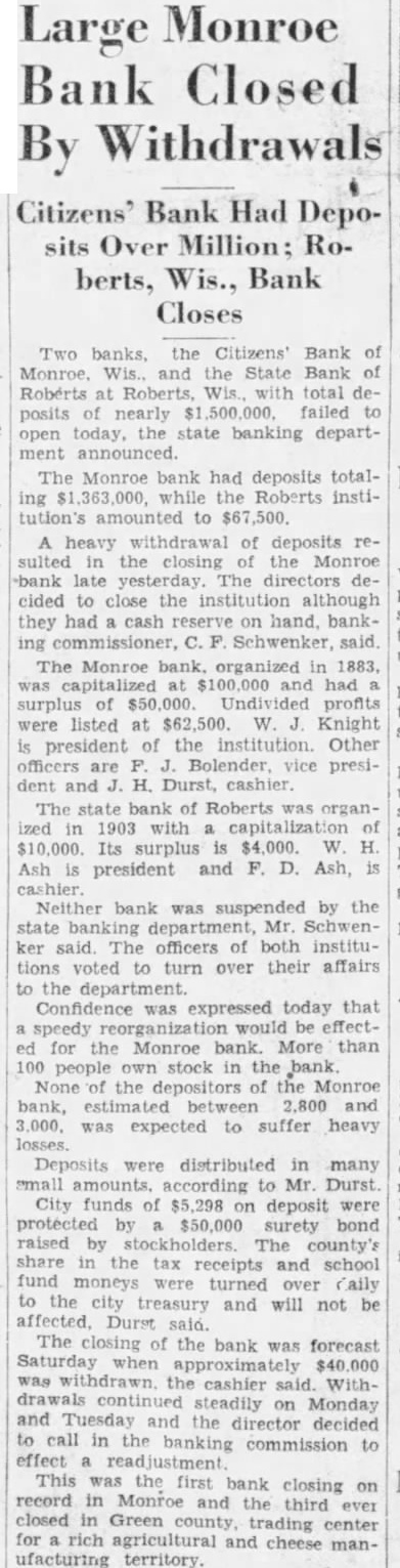Large Monroe Bank Closed By Withdrawals Citizens' Bank Had Deposits Over Million; Roberts, Wis., Bank Closes Two banks, the Citizens' Bank Wis., and the State Bank Roberts Roberts, with total posits nearly failed open today, the state banking department announced. Monroe bank had deposits totaling while the Roberts institution's amounted to heavy withdrawal of deposits sulted the closing the Monroe bank The cided to close the institution although they had cash on hand. banking Schwenker, said The Monroe bank, organized 1883, was capitalized $100,000 and had surplus of profits were listed at $62,500. W. Knight president of the institution. Other officers president and Durst, cashier. The state bank of Roberts ized 1903 with Its surplus $4,000. W. H. Ash president and Ash, Neither bank was suspended by the state banking department, Mr. Schwenker said. The officers of both institutions voted to turn over their affairs the department. Confidence was expressed today that speedy would be effectfor the Monroe bank. More than 100 people own stock in the bank None the depositors of the Monroe bank, estimated between 2,800 and was expected to suffer heavy Deposits were distributed in many small according Mr. City funds of deposit were protected $50,000 surety bond raised The county's share the tax receipts and school fund turned over daily to the city treasury and will not Durst The closing the bank was forecast when approximately cashier said. Withcontinued steadily on Monday and Tuesday and the decided to call in the banking commission effect This was the first bank closing record in Monroe and the third ever closed Green trading center for rich and cheese manufacturing territory.