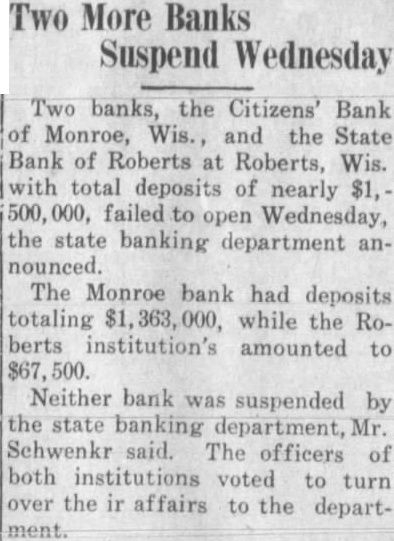 Two More Banks Suspend Wednesday Two banks, the Citizens' Bank of Monroe, Wis., and the State Bank of Roberts at Roberts, Wis. with total deposits of nearly $1, failed to open Wednesday, the state banking department announced. The Monroe bank had deposits totaling $1,363,000, while the Roberts institution's amounted to $67, Neither bank was suspended by the state banking department, Mr. Schwenkr said. The officers of both institutions voted to turn over the ir affairs to the department.
