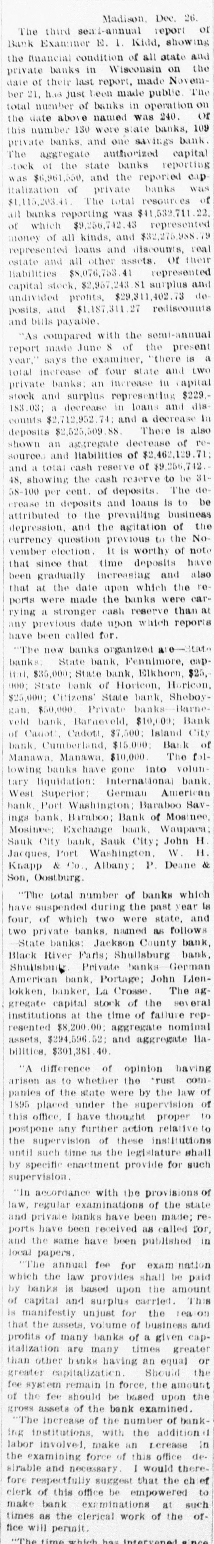 EXAMINER KIDD'S REPORT. Some Radical Changes in the State Banking Laws Are Advocated. Madison, Wis., Dec. 26.-The semiannual report of State Bank Examiner E. I. Kidd is complete. It shows the financial condition of all state and private banks on November 21, 1896. The total number of banks in operation on the date named was 240. Of this number 130 were state banks, 109 private banks and one savings bank. The aggregate authorized capital stock of the state banks reporting was $6,961.550 and the reported capitalization of private banks was $1,115,203.41. The total was $41,532,711.22 of which $9.256,742.43 represented money of all kinds, and $32,275,968.79 represented loans and discounts, real estate and all other assets. Of their liabilities $8.076,753.41 represented capital stock. $2,927.243.81: surplus and undivided profits. $29,311,402.73 deposits and $1,187,311.27 rediscounts and bills payable. As compared with the semi-annual report made June 8 of the present year, there is shown a total increase of four state and two private banks, an increase in capital stock and surplus representing $229,183.03, a decrease in loans and discounts of $2,712,952.74. and a decrease in deposits of $2,525,509.88. There is also shown an aggregate decrease of resources and liabilities of $2,462,129.71 and a total cash reserve of $9,256,742.43, showing the cash reserve to be 31.58 per cent. of deposits. The new banks organized, with name, location and capitalization are as follows: State Banks-The State bank, Fennimore. $35,000; the State bank, Elkhorn. $25,000: State Bank of Horicon, Horicon, $25,000: Citizens' State bank, Sheboygan. $50,000. Private Banks-Barneveld bank, Barneveld. $10,000; Bank of Cadot, Cadot, $7500: Island City bank, Cumberland, $15,000; Bank of Manawa, Manawa, $10,000. The following banks have gone into voluntary liquidation: International bank, West Superior: German American bank, Port Washington: Baraboo Savings bank, Baraboo: Bank of Mosinee, Mosinee; Exchange bank, Waupaca; Sauk City bank. Sauk City; John H. Jacques. Port Washington: W. H. Knapp & Co., Albany; P. Daane & Son. Oostburg. The total number of banks which have suspended during the past year is four, of which two were state, and two private banks. as follows: State Banks-Jackson County bonk. Black River Falls; Shullsburg bank, Shullsburg. Private Banks-German-American bank. Portage; John Lienlokken, banker, La Crosse. Mr. Kidd makes a lengthy report regarding the banking laws. etc., which, he says, are very loose in Wisconsin. He suggests many radical changes in regard to the management of banks and advocates the encouragement of state banks in small towns instead of private depositories. Under the present laws, he says, the state examiner has little power and in case of failures he can only investigate the same and report to the governor. He says the laws should be more stringent in permitting officers of banks to borrow