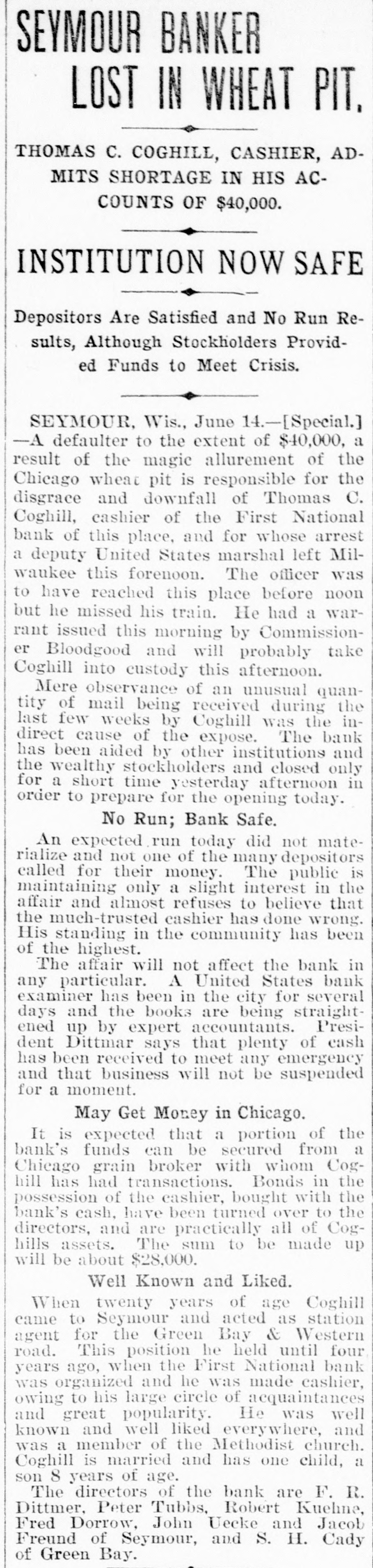 SEYMOUR BANKER LOST IN WHEAT PIT. THOMAS C. COGHILL, CASHIER, ADMITS SHORTAGE IN HIS ACCOUNTS OF $40,000. INSTITUTION NOW SAFE Depositors Are Satisfied and No Run Results, Although Stockholders Provided Funds to Meet Crisis. SEYMOUR, Wis., June 14.-[Special.] -A defaulter to the extent of $40,000, a result of the magic allurement of the Chicago wheat pit is responsible for the disgrace and downfall of Thomas C. Coghill, cashier of the First National bank of this place, and for whose arrest a deputy United States marshal left Milwaukee this forenoon. The officer was to have reached this place before' noon but he missed his train. He had a warrant issued this morning by Commissioner Bloodgood and will probably take Coghill into custody this afternoon. Mere observance of an unusual quantity of mail being received during the last few weeks by Coghill was the indirect cause of the expose. The bank has been aided by other institutions and the wealthy stockholders and closed only for a short time yesterday afternoon in order to prepare for the opening today. No Run; Bank Safe. An expected run today did not materialize and not one of the many depositors called for their money. The public is maintaining only a slight interest in the affair and almost refuses to believe that the much-trusted cashier has done wrong. His standing in the community has been of the highest. The affair will not affect the bank in any particular. A United States bank examiner has been in the city for several days and the books are being straightened up by expert accountants. President Dittmar says that plenty of cash has been received to meet any emergency and that business will not be suspended for a moment. May Get Money in Chicago. It is expected that a portion of the bank's funds can be secured from a Chicago grain broker with whom Coghill has had transactions. Bonds in the possession of the cashier. bought with the bank's cash, have been turned over to the directors, and are practically all of Coghills assets. The sum to be made up will be about $28,000. Well Known and Liked. When twenty years of age Coghill came to Seymour and acted as station agent for the Green Bay & Western road. This position he held until four years ago, when the First National bank was organized and he was made cashier, owing to his large circle of acquaintances and great popularity. He was well known and well liked everywhere, and was a member of the Methodist church. Coghill is married and has one child, a son 8 years of age. The directors of the bank are F. R. Dittmer. Peter Tubbs. Robert Kuehne, Fred Dorrow, John Uecke and Jacob Freund of Seymour, and S. H. Cady of Green Bay.