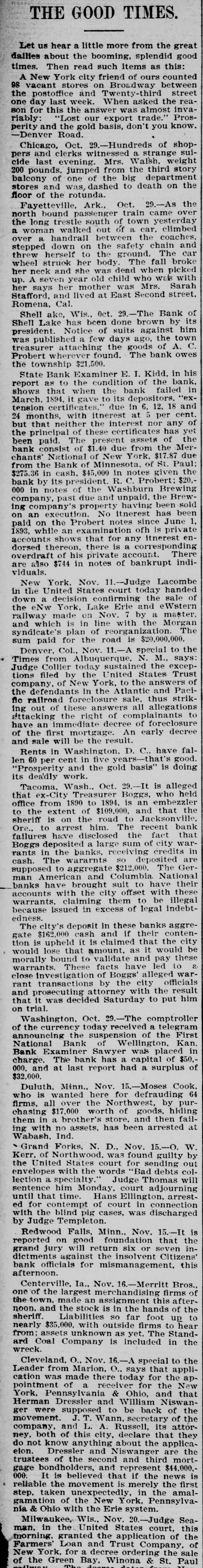 THE GOOD TIMES. Let us hear a little more from the great dailles about the booming, splendid good times. Then read such items as this: A New York city friend of ours counted 98 vacant stores on Broadway between the postoffice and Twenty-third street one day last week. When asked the reason for this the answer was almost invariably: "Lost our export trade." Prosperity and the gold basis, don't you know. -Denver Road. Chicago, Oct. 29.-Hundreds of shoppers and clerks witnessed a strange suicide last evening. Mrs. Walsh, weight 200 pounds, jumped from the third story balcony of one of the big department stores and was, dashed to death on the floor of the rotunda. Fayetteville, Ark., Oct. 29.-As the north bound passenger train came over the long trestle south of town yesterday a woman walked out of a car, climbed over a handrail between the coaches, stepped down on the safety chain and threw herself to the ground. The car wheel struck her body. The fall broke her neck and she was dead when picked up. A seven year old child who was with her says her mother was Mrs. Sarah Stafford, and lived at East Second street, Romena, Cal. Shell ake, Wis., Oct. 29.-The Bank of Shell Lake has been done brown by its president. Notice of suits against him was published a few days ago, the town treasurer attaching the goods of A. C. Probert wherever found. The bank owes the township $21,500. State Bank Examiner E. I. Kidd, in his report as to the condition of the bank, shows that when the bank failed in March. 1894, it gave to its depositors, "extension certificates. due in 6, 12, 18 and 24 months with itnerest at 5 per cent. but that neither the interest nor any of the principal of these certificates has yet been paid. The present assets of the bank consist of $1.40 due from the Merchants' National of New York, $17.87 due from the Bank of Minnesota, of St. Paul; $275.36 in cash, $45,000 in notes given the bank by its president. R. C. Probert: $20,000 in notes of the Washburn Brewing company, past due and unpaid, the Brewing company's property having been sold on an execution. No itnerest has been paid on the Probert notes since June 1, 1893, while an examination ofh is private accounts shows that for any itnerest endorsed thereon. there is a corresponding overdraft of his private account. There are also $744 in notes of bankrupt individuals. New York. Nov. 11.-Judge Lacombe in the United States court today handed down a decision confirming the sale of the eNw York, Lake Erie and eWstern railway made on Nov. 7 by a master. and which is in line with the Morgan syndicate's plan of reorganization. The sum paid for the road is $20,000,000. Denver. Col., Nov. 11.-A special to the Times from Albuquerque, N. M., says: Judge Collier today sustained the exceptions filed by the United States Trust company. of New York, to the answers of the defendants in the Atlantic and Paciflc railroad foreclosure sale, thus striking out of these answers all allegations attacking the right of complainants to have an immediate decree of foreclosure of the first mortgage. An early decree and sale will be the result. Rents in Washington. D. C.. have fallen 60 per cent in five years-that's good. "Prosperity and the gold basis" is doing its deadly work. Tacoma, Wash., Oct. 29.-It is alleged that ex-City Treasurer Boggs, who held office from 1890 to 1894. is an embezzler to the extent of $109,000. and that the sheriff is on the road to Jacksonville, Ore., to arrest him. The recent bank failures have disclosed the fact that Boggs deposited a large sum of city warrants in the banks, receiving credits in cash. The wararnts SO deposited are supposed to aggregate $212,000. The German American and Columbia National banks have brought suit to have their accounts with the city offset with these warrants. claiming them to be illegal because issued in excess of legal indebtedness. The city's deposit in these banks aggregate $162,000 cash and if their contention is upheld it is claimed that the city would lose that amount, as it would be morally bound to validate and pay these warrants. These facts have led to 2 close Investigation of Boggs' alleged warrant transactions by the city officials and prosecuting attorney with the result that it was decided Saturday to put him on trial. Washington, Oct. 29.-The comptroller of the currency today received a telegram announcing the suspension of the First National Bank of Wellington, Kan. Bank Examiner Sawyer was placed in charge. The bank has a capital of $50.000, and at last report had a surplus of $32,000. Duluth. Minn., Nov. 15.-Moses Cook, who is wanted here for defrauding 64 firms. all over the Northwest, by purchasing $17,000 worth of goods, hiding them in a brother's store, and then failing with no assets, has been arrested at Wabash, Ind. Grand Forks, N. D., Nov. 15.-O. W. Kerr. of Northwood. was found guilty by the United States court for sending out envelopes with the words "Bad debts collection a specialty.' Judge Thomas will sentence him Monday, court adjourning until that time. Hans Ellington, arrested for contempt of court in connection with the blind pig cases, was discharged by Judge Templeton. Redwood Falls, Minn., Nov. 15.-It is reported on good foundation that the grand jury will return six or seven indictments against the insolvent Citizens' bank officials for mismanagement, this afternoon. Centerville, Ia., Nov. 16.-Merritt Bros., one of the largest merchandising firms of the town, made an assignment this afternoon. and the stock is in the hands of the sheriff. Liabilities SO far foot up to nearly $35,000. with outside firms to hear from: assets unknown as yet. The Standard Coal Company is included in the wreck. Cleveland, O., Nov. 16.-A special to the Leader from Marion, O., says that application was made there today for the ap-