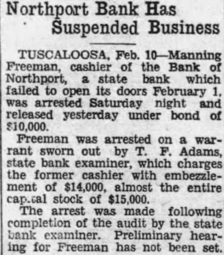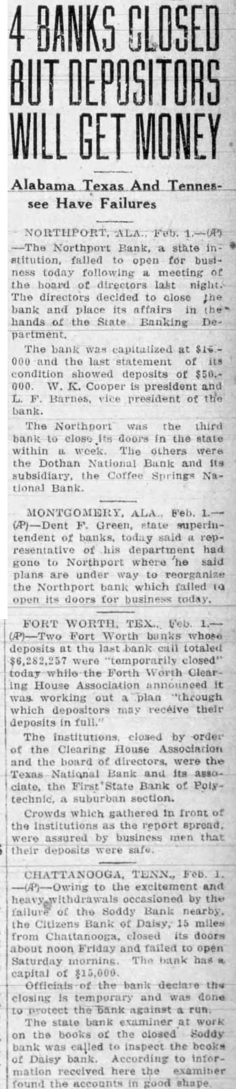 BANKS CLOSED GET Alabama Texas And Tennessee Have Failures ALA. Northport Bank, state stitution, falled open for busitoday following meeting of the hoard directors night. The directors decided close the bank and place its affairs in the State Banking partment. The bank was capitalized at $16000 and the last statement showed deposits of $50.K. Cooper president Barnes, vice president of the bank. The Northport third bank close Its doors in the state within week. The others the Dothan National Bank subsidiary. the Coffee National MONTGOMERY ALA., Feb. (P)-Dent Green, superintendent of banks, today said resentative of department had gone Northport where he plans reorganize the Northport which failed open its doors for business today. Fort deposits the last bank call totaled $6,282,257 were closed" the Forth Worth Clearing House working out plan "through which may receive their deposits in The institutions closed by order of the Clearing House and the hoard of directors, were the Bank its clate, the Bank of Crowds which gathered in front the Institutions the report spread. were assured by that their deposits safe. TENN., to the excitement and by the of the Bank the Bank Daisy, 15 from closed doors about Friday failed open Saturday morning bank has capital of the bank declare closing and to the bank against The state bank examiner the books the closed Soddy bank inspect the books Daisy bank. According to mation received here the found the accounts in good
