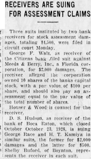 RECEIVERS ARE SUING FOR ASSESSMENT CLAIMS Three suits instituted by two bank for stock damtotaling were filed in circuit court Monday George F. receiver of the Citizens bank filed suit against Meeds & Berry. Inc., Florida corporation, for $2,000 damages. The receiver alleged the corporation 10 shares of the banks capital with par of $100 per and should also pay an sessment equal to the par value of the total number of shares. Houser & Wood counsel for the receiver. D. S. Hudson. as receiver of the bank of Boca Raton, which closed October October 23. 1928, is suing George Race and H. T. Kamiya in similar suits, the former for $2,000 damages and the latter for $500. Shelby Buford. of Boynton, represents the receiver in each suit.