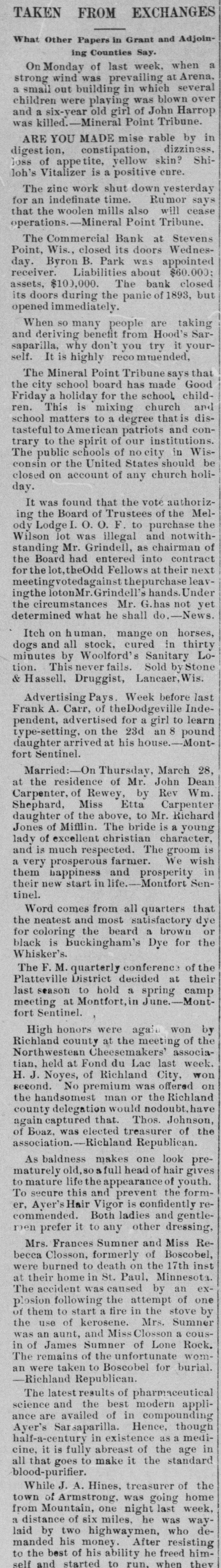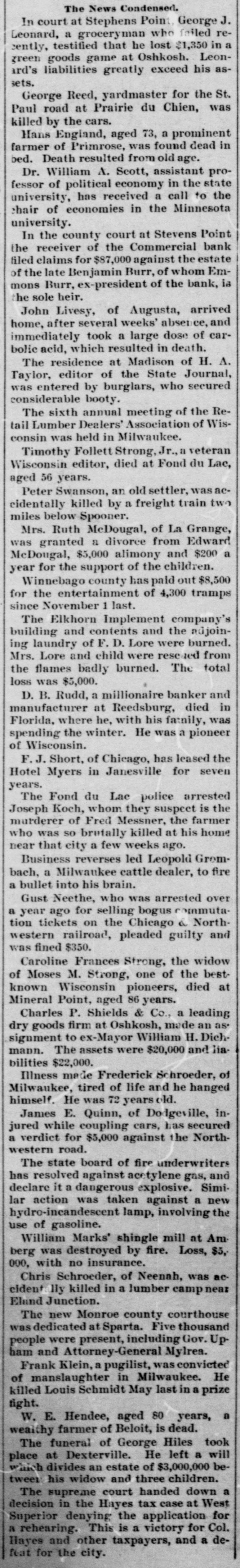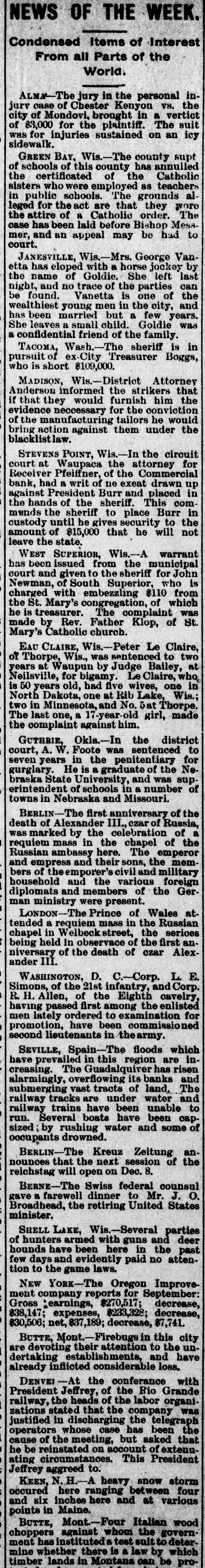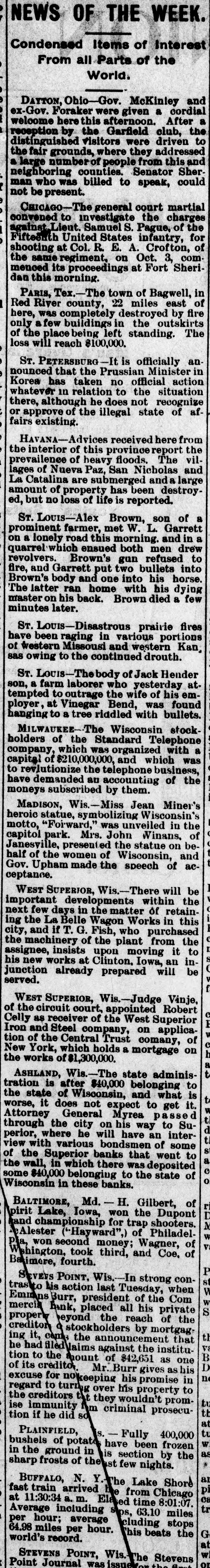 NEWS OF THE WEEK. Condensed Items of Interest From all Parts of the World. DAYTON, Ohio-Gov. McKinley and ex-Gov. Foraker were given a cordial welcome here this afternoon. After a reception by the Garfield club, the distinguished visitors were driven to the fair grounds, where they addressed a large number of people from this and neighboring counties. Senator Sherman who was billed to speak, could not be present. CHICAGO-The general court martial convened to investigate the charges against Lieut. Samuel S. Pague, of the Fifteenth United States infantry, for shooting at Col. R. E. A. Crofton, of the same regiment, on Oct. 3, com. menoed its proceedings at Fort Sheridan this morning. PARIS, Tex.-The town of Bagwell, in Red River county, 22 miles east of here, was completely destroyed by fire only a few buildings in the outskirts of the place being left standing. The loss will reach $100,000. ST. PETERSBURG is officially announced that the Prussian Minister in Korea has taken no official action whatever in relation to the situation there, although he does not recognize or approve of the illegal state of affairs existing. HAVANA-Advices received here from the interior of this province report the prevailence of heavy floods. The villages of Nueva Paz, San Nicholas and La Catalina are submerged and a large amount of property has been destroyed, but no loss of life is reported. Sr. Louis-Alex Brown, son of a prominent farmer, met W. L. Garrett on a lonely road this morning. and in a quarrel which ensued both men drew revolvers. Brown's gun refused to fire, and Garrett put two bullets into Brown's body and one into his horse. The latter ran home with his dying master on his back. Brown died a few minutes later. ST. LOUIs-Disastrous prairie fires have been raging in various portions of western Missousi and western Kan, sas owing to the continued drouth. ST. Louis-Thebody of Jack Hender son, a farm laborer who yesterday attempted to outrage the wife of his employer, at Vinegar Bend, was found hanging to a tree riddled with bullets. MILWAUKEE-The Wisconsin stockholders of the Standard Telephone company, which was organized with a capital of $210,000,000, and which was to revlutionize the telephone business, have demanded au accounting of the moneys subscribed by them. MaDISON, Wis.-Miss Jean Miner's heroic statue, symbolizing Wisconsin's motto, "Forward," was unveiled in the capitol park. Mrs. John Winans, of Janesville, presented the statue on behalf of the women of Wisconsin, and Gov. Upham made the speech of acceptance. WEST SUPERIOR, Wis.-There will be important developments within the next few days in the matter of retaining the La Belle Wagon Works in this city, and if T. G. Fish, who purchased the machinery of the plant from the assignee, insists upon moving it to his new works at Clinton, Iowa, an injunction already prepared will be served. WEST SUPERIOR, Wis.-Judge Vinje, of the circuit court, appointed Robert Celly as receiver of the West Superior Iron and Steel company, on application of the Central Trust comany, of New York, which holds a mortgage on the works of $1,300,000. t ASHLAND, Wis.-The state administration is after $40,000 belonging to the state of Wisconsin, and what is t worse, it does not expect to get it. W Attorney General Myrea sse d t through the city on his way to Sud perior, where he will have an intert view with various bondsmen of some S of the Superior banks that went to a the wall, in which there was deposited c some $40,000 belonging to the state of o Wisconsin in these banks. BALTIMORE, Md. - H. Gilbert, of pirit Lake, Iowa, won the Dupont sand championship for trap shooters. M Alester ("Hayward",) of Philadelpla, won second money; Wagner, of V Wshington, took third, and Coe, of Basimore, fourth. P SEVENS POINT, Wis.-In strong contrasto Lis action last Tuesday, when W Emmans Burr, president of the Com mercia bank, placed all his private S properly eyond the reach of the creditor a stockholders by mortgagthe ing it, come the announcement that va he had iledvaims against the instituB tion to the amount of $42,651 as one D of its creditor Mr. Burr gives as his no excuse for nokeeping his promise in regard to turnig over his property to the creditors tat they wouldn't prom. to ise immunity Am criminal prosecutb tion if he did so at tu PLAINFIELD, - Fully 400,000 W bushels of potato have been frozen as in the ground in is section by the , sharp frosts of the ast few nights. at BUFFALO, N. Y. The Lake Shore pi fast train arrived the from Chicago CE at 11:30:34 a. m. Ela time 8:01:07. tr Average including Stps, 63.10 miles per hour; average cluding stops 64.98 miles per hour. This beats the G world's record. at STEVENS POINT VETA