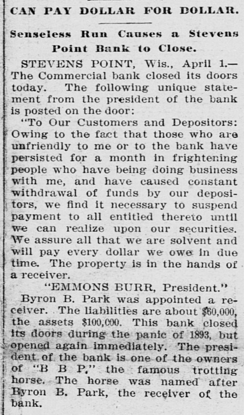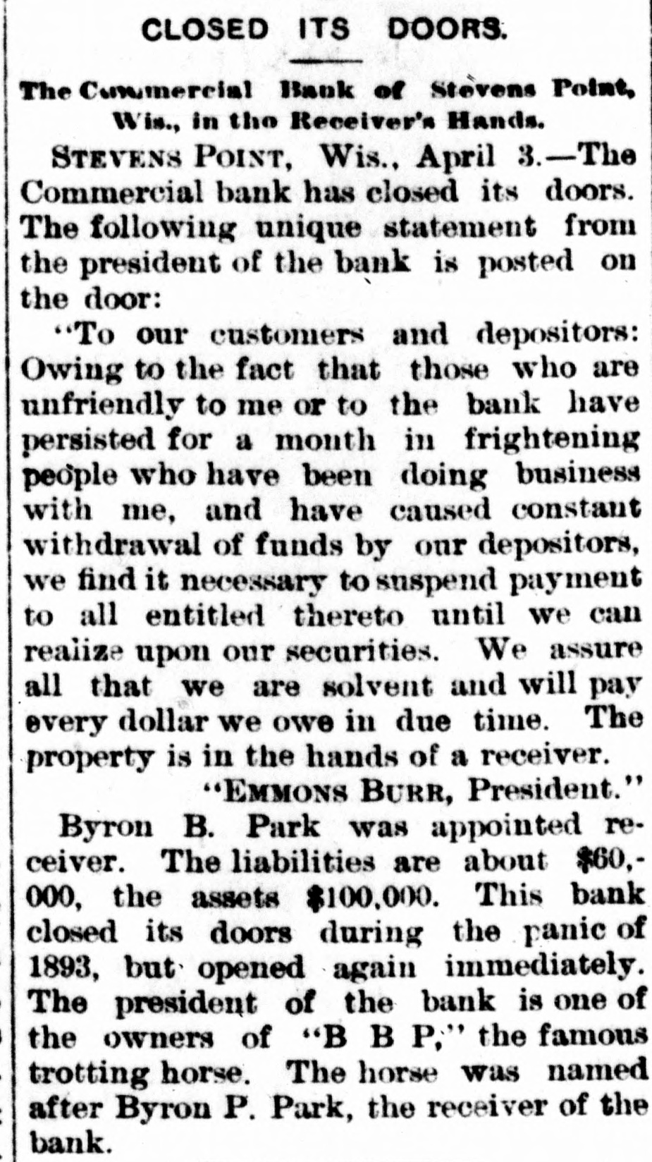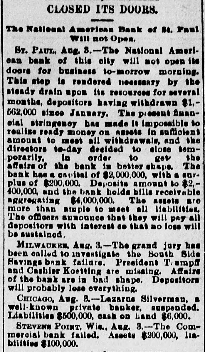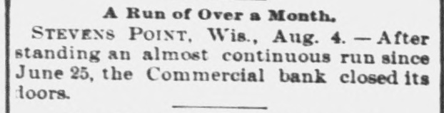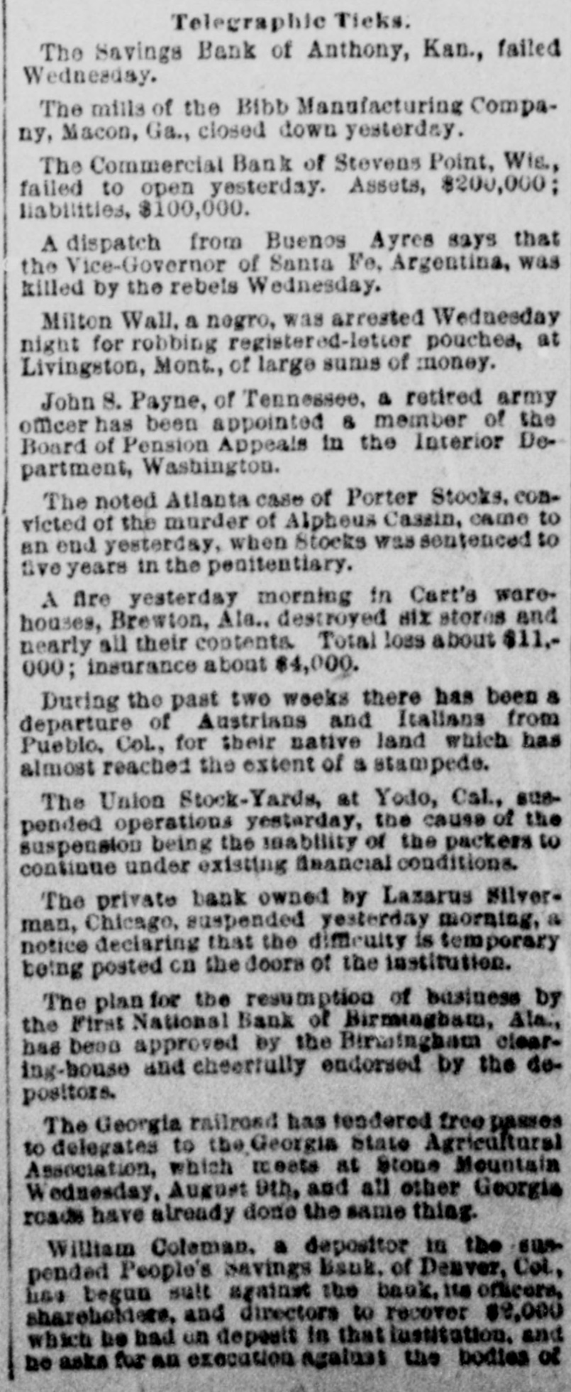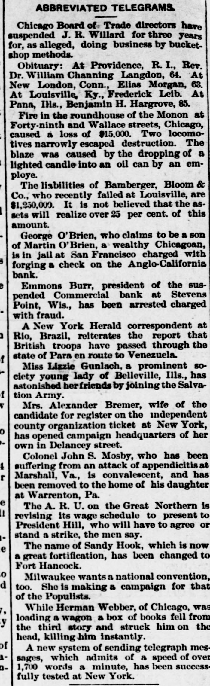 NEWS OF THE WEEK. Condensed Items of Interest From all Parts of the World. DAYTON, Ohio-Gov. McKinley and ex-Gov. Foraker were given a cordial welcome here this afternoon. After a reception by the Garfield club, the distinguished visitors were driven to the fair grounds, where they addressed a large number of people from this and neighboring counties. Senator Sherman who was billed to speak, could not be present. CHICAGO-The general court martial convened to investigate the charges against Lieut. Samuel S. Pague, of the Fifteenth United States infantry, for shooting at Col. R. E. A. Crofton, of the same regiment, on Oct. 3, com. menoed its proceedings at Fort Sheridan this morning. PARIS, Tex.-The town of Bagwell, in Red River county, 22 miles east of here, was completely destroyed by fire only a few buildings in the outskirts of the place being left standing. The loss will reach $100,000. ST. PETERSBURG is officially announced that the Prussian Minister in Korea has taken no official action whatever in relation to the situation there, although he does not recognize or approve of the illegal state of affairs existing. HAVANA-Advices received here from the interior of this province report the prevailence of heavy floods. The villages of Nueva Paz, San Nicholas and La Catalina are submerged and a large amount of property has been destroyed, but no loss of life is reported. Sr. Louis-Alex Brown, son of a prominent farmer, met W. L. Garrett on a lonely road this morning. and in a quarrel which ensued both men drew revolvers. Brown's gun refused to fire, and Garrett put two bullets into Brown's body and one into his horse. The latter ran home with his dying master on his back. Brown died a few minutes later. ST. LOUIs-Disastrous prairie fires have been raging in various portions of western Missousi and western Kan, sas owing to the continued drouth. ST. Louis-Thebody of Jack Hender son, a farm laborer who yesterday attempted to outrage the wife of his employer, at Vinegar Bend, was found hanging to a tree riddled with bullets. MILWAUKEE-The Wisconsin stockholders of the Standard Telephone company, which was organized with a capital of $210,000,000, and which was to revlutionize the telephone business, have demanded au accounting of the moneys subscribed by them. MaDISON, Wis.-Miss Jean Miner's heroic statue, symbolizing Wisconsin's motto, "Forward," was unveiled in the capitol park. Mrs. John Winans, of Janesville, presented the statue on behalf of the women of Wisconsin, and Gov. Upham made the speech of acceptance. WEST SUPERIOR, Wis.-There will be important developments within the next few days in the matter of retaining the La Belle Wagon Works in this city, and if T. G. Fish, who purchased the machinery of the plant from the assignee, insists upon moving it to his new works at Clinton, Iowa, an injunction already prepared will be served. WEST SUPERIOR, Wis.-Judge Vinje, of the circuit court, appointed Robert Celly as receiver of the West Superior Iron and Steel company, on application of the Central Trust comany, of New York, which holds a mortgage on the works of $1,300,000. t ASHLAND, Wis.-The state administration is after $40,000 belonging to the state of Wisconsin, and what is t worse, it does not expect to get it. W Attorney General Myrea sse d t through the city on his way to Sud perior, where he will have an intert view with various bondsmen of some S of the Superior banks that went to a the wall, in which there was deposited c some $40,000 belonging to the state of o Wisconsin in these banks. BALTIMORE, Md. - H. Gilbert, of pirit Lake, Iowa, won the Dupont sand championship for trap shooters. M Alester ("Hayward",) of Philadelpla, won second money; Wagner, of V Wshington, took third, and Coe, of Basimore, fourth. P SEVENS POINT, Wis.-In strong contrasto Lis action last Tuesday, when W Emmans Burr, president of the Com mercia bank, placed all his private S properly eyond the reach of the creditor a stockholders by mortgagthe ing it, come the announcement that va he had iledvaims against the instituB tion to the amount of $42,651 as one D of its creditor Mr. Burr gives as his no excuse for nokeeping his promise in regard to turnig over his property to the creditors tat they wouldn't prom. to ise immunity Am criminal prosecutb tion if he did so at tu PLAINFIELD, - Fully 400,000 W bushels of potato have been frozen as in the ground in is section by the , sharp frosts of the ast few nights. at BUFFALO, N. Y. The Lake Shore pi fast train arrived the from Chicago CE at 11:30:34 a. m. Ela time 8:01:07. tr Average including Stps, 63.10 miles per hour; average cluding stops 64.98 miles per hour. This beats the G world's record. at STEVENS POINT VETA