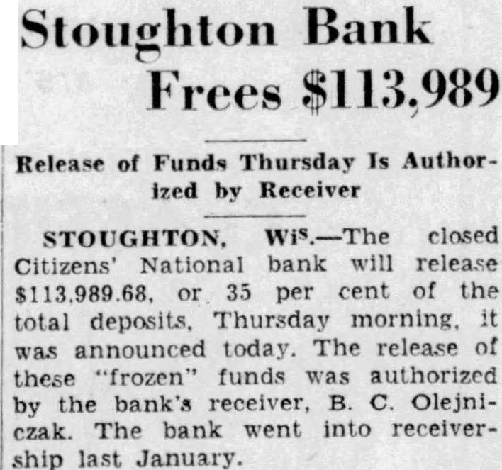Stoughton Bank Frees $113,989 Release Funds Thursday Is Authorized Receiver STOUGHTON, closed Citizens' National bank will release per cent of the total deposits, Thursday morning. was announced today. The release these "frozen" funds authorized by the bank's receiver, Olejniczak. The bank went receivership last January.