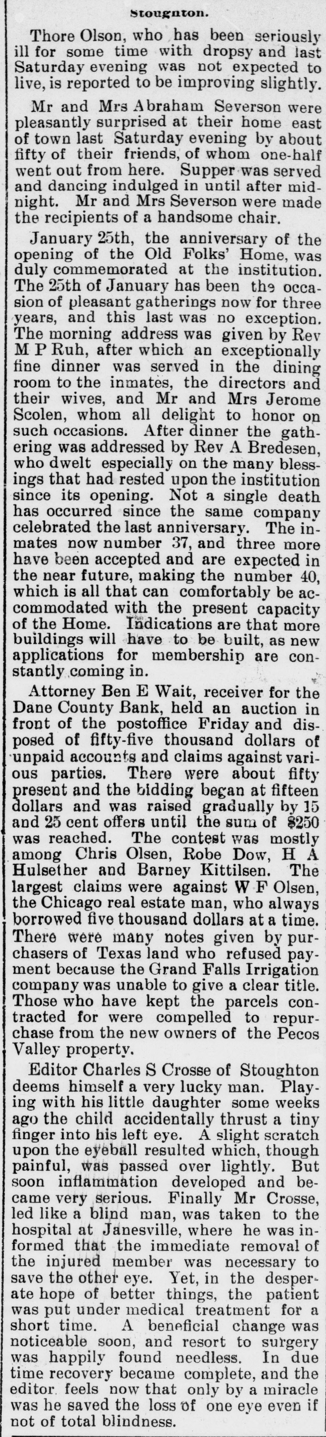 CASHIER JOICE SETTLES. Pays the Stoughton Bank $15,000, Ending the Litigation. The case of John H. Joice, former cashier of the Dane County bank of Stoughton, accused of receiving deposits in his bank after he knew it was insolvent, was settled in the municipal court at Madison Tuesday in a sudden manner, much to the surprise of all concerned, except the attorneys for the defense. The case was called at 2 o'clock, but owing to the absence of one of the jurors, Lewis Dahl of Mt. Horeb, who was sick, the court was adjourned on motion of Rufus B. Smith, one of the attorneys for the defense, until a conference of the attorneys could be held and some decision arrived at concerning the continuance of the case. When the court reassembled at 3 o'clock Mr. Smith stated to the court that further information had been filed with the clerk, and that his client would plead guilty to the charge against him. He further stated that the relatives and friends of the defendant had by almost superhuman efforts succeeded in raising a sufficient amount with which to satisfy the creditors of the bank, and that the receiver of the bank, B. E. Wait of Stoughton, was satisfied with such an arrangement. Mr. Smith ended with a plea for leniency, saying that the amount raised by friends of Mr. Joice amounted to some $15,000; that the costs in the case amounted to $1,800, and asked that a fine of $100 be imposed, which, with the costs and the amount raised for settlement, would make it practically a fine of $17,000. The court then asked the defendant if this arrangement was satisfactory to him, and receiving an affirmative reply, ordered, on the plea of guilty by Mr. Joice, that the defendant be fined $100, together with the costs, on the condition that he make the settlement proposed, or in default be committed to the Dane county jail for one year. The fine and costs were accordingly paid and the defendant discharged.