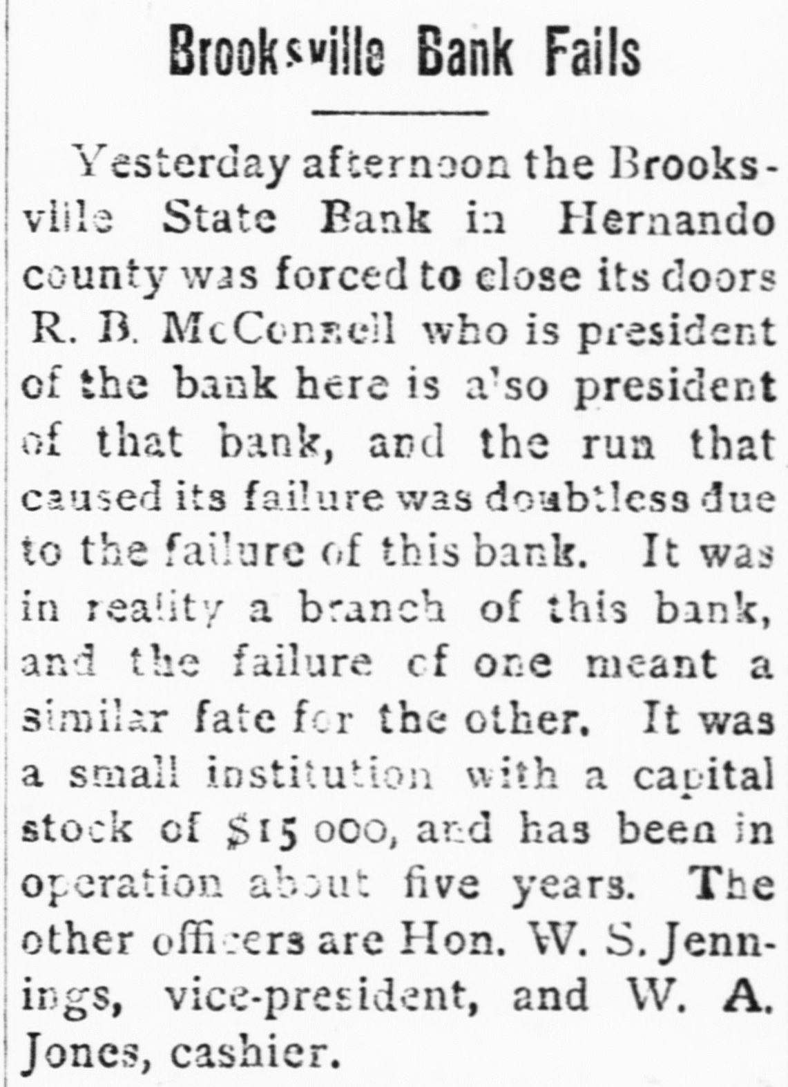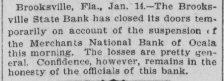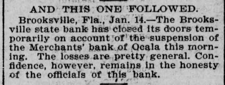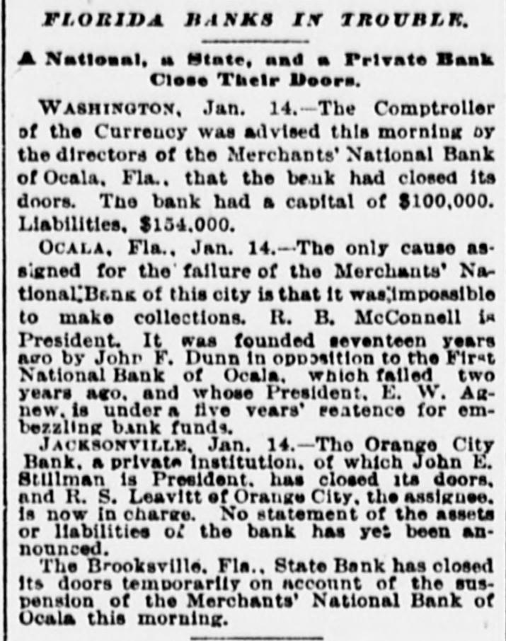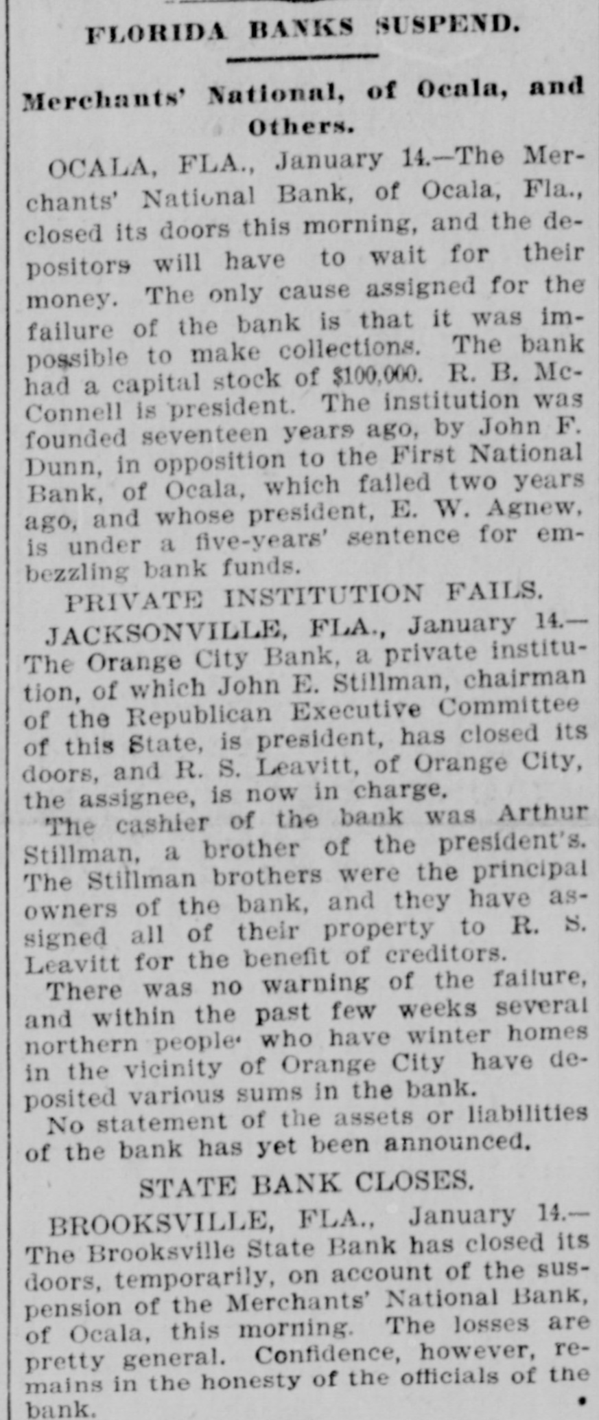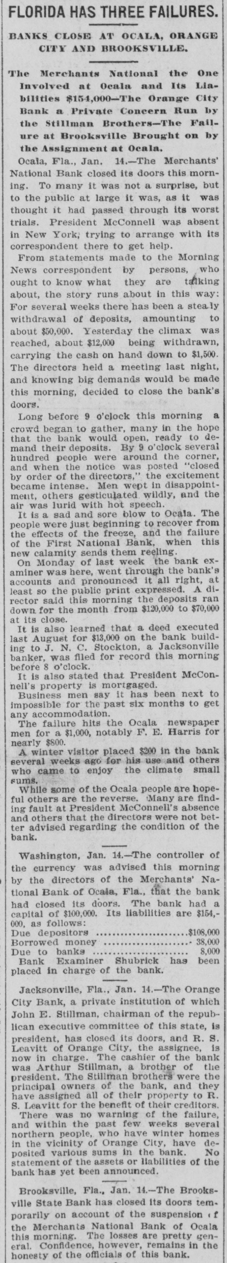 FLORIDA HAS THREE FAILURES. BANKS CLOSE AT OCALA, ORANGE CITY AND BROOKSVILLE. The Merchants National the One Involved at Ocala and Its Liabilities $154,000-The Orange City Bank a Private Concern Run by the Stillman Brothers-The Failure at Brooksville Brought on by the Assignment at Ocala. Ocala, Fla., Jan. 14.-The Merchants' National Bank closed its doors this morning. To many it was not a surprise, but to the public at large it was, as it was thought it had passed through its worst trials. President McConnell was absent in New York, trying to arrange with its correspondent there to get help. From statements made to the Morning News correspondent by persons, who ought to know what they are talking about, the story runs about in this way: For several weeks there has been a stealy withdrawal of deposits, amounting to about $50,000. Yesterday the climax was reached, about $12,000 being withdrawn, carrying the cash on hand down to $1,500. The directors held a meeting last night, and knowing big demands would be made this morning, decided to close the bank's doors. Long before 9 o'clock this morning a crowd began to gather, many in the hope that the bank would open, ready to demand their deposits. By 9 o'clock several hundred people were around the corner, and when the notice was posted "closed by order of the directors," the excitement became intense. Men wept in disappointment, others gesticulated wildly, and the air was lurid with hot speech, It is a sad and sore blow to Ocala. The people were just beginning to recover from the effects of the freeze, and the failure of the First National Bank, when this new calamity sends them reeling. On Monday of last week the bank examiner was here, went through the bank's accounts and pronounced it all right, at least so the public print expressed. A director said this morning the deposits ran down for the month from $120,000 to $70,000 at its close. It is also learned that a deed executed last August for $13,000 on the bank building to J. N. C. Stockton, a Jacksonville banker, was filed for record this morning before 8 o'clock. It is also stated that President McConnell's property is mortgaged. Business men say it has been next to impossible for the past six months to get any accommodation. The failure hits the Ocala newspaper men for a $1,000, notably F. E. Harris for nearly $800. A winter visitor placed $200 in the bank several weeks ago for his use and others who came to enjoy the climate small sums. While some of the Ocala people are hopeful others are the reverse. Many are finding fault at President McConnell's absence and others that the directors were not better advised regarding the condition of the bank. Washington, Jan. 14.-The controller of the currency was advised this morning by the directors of the Merchants' National Bank of Ocala, Fla., that the bank had closed its doors. The bank had a capital of $100,000. Its liabilities are $154,000, as follows: $108,000 Due depositors 38,000 Borrowed money 8,000 Due to banks Bank Examiner Shubrick has been placed in charge of the bank. Jacksonville, Fla., Jan. 14.-The Orange City Bank, a private institution of which John E. Stillman, chairman of the republican executive committee of this state, is president, has closed its doors, and R. S. Leavitt of Orange City, the assignee, is now in charge. The cashier of the bank was Arthur Stillman, a brother of the president. The Stillman brothers were the principal owners of the bank, and they have assigned all of their property to R. S. Leavitt for the benefit of their creditors. There was no warning of the failure, and within the past few weeks several northern people, who have winter homes in the vicinity of Orange City, have deNo posited various sums in the bank. statement of the assets or liabilities of the bank has yet been announced Brooksville, Fla., Jan. 14.-The Brooksville State Bank has closed its doors tem. porarily on account of the suspension f the Merchants National Bank of Ocala this morning. The losses are pretty general. Confidence, however, remains in the honesty of the officials of this bank.