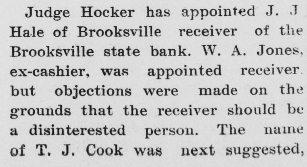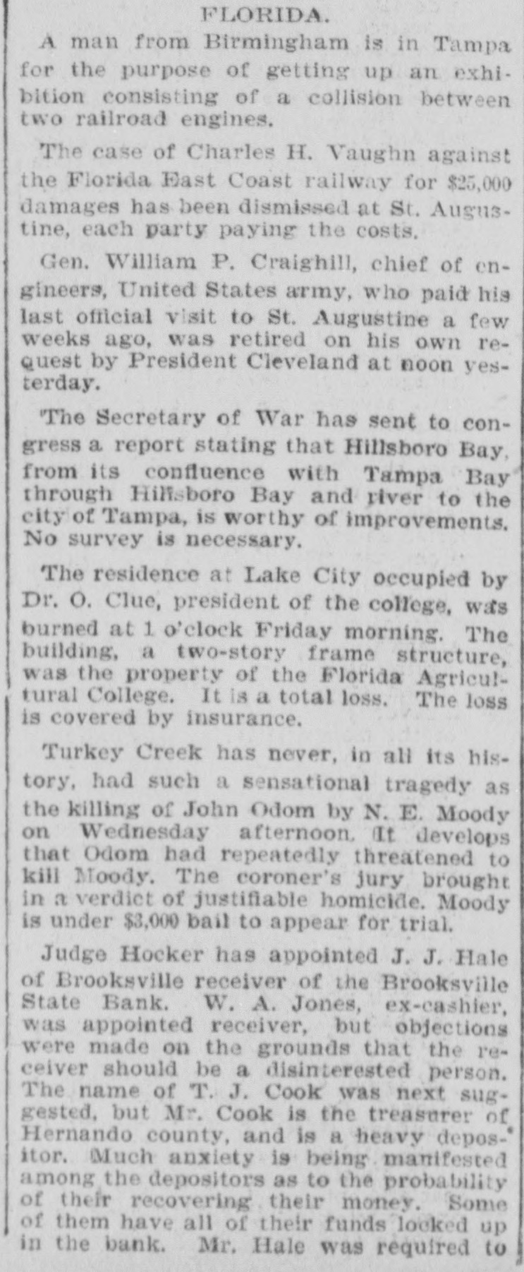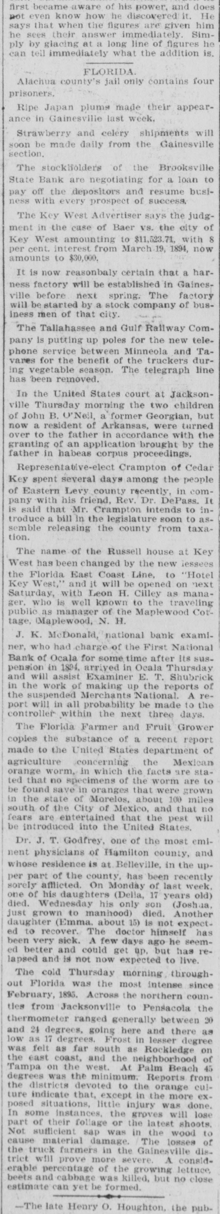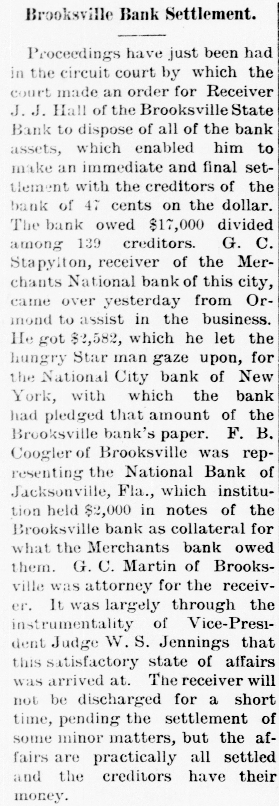 FLORIDA HAS THREE FAILURES. BANKS CLOSE AT OCALA, ORANGE CITY AND BROOKSVILLE. The Merchants National the One Involved at Ocala and Its Liabilities $154,000-The Orange City Bank a Private Concern Run by the Stillman Brothers-The Failure at Brooksville Brought on by the Assignment at Ocala. Ocala, Fla., Jan. 14.-The Merchants' National Bank closed its doors this morning. To many it was not a surprise, but to the public at large it was, as it was thought it had passed through its worst trials. President McConnell was absent in New York, trying to arrange with its correspondent there to get help. From statements made to the Morning News correspondent by persons, who ought to know what they are talking about, the story runs about in this way: For several weeks there has been a stealy withdrawal of deposits, amounting to about $50,000. Yesterday the climax was reached, about $12,000 being withdrawn, carrying the cash on hand down to $1,500. The directors held a meeting last night, and knowing big demands would be made this morning, decided to close the bank's doors. Long before 9 o'clock this morning a crowd began to gather, many in the hope that the bank would open, ready to demand their deposits. By 9 o'clock several hundred people were around the corner, and when the notice was posted "closed by order of the directors," the excitement became intense. Men wept in disappointment, others gesticulated wildly, and the air was lurid with hot speech, It is a sad and sore blow to Ocala. The people were just beginning to recover from the effects of the freeze, and the failure of the First National Bank, when this new calamity sends them reeling. On Monday of last week the bank examiner was here, went through the bank's accounts and pronounced it all right, at least so the public print expressed. A director said this morning the deposits ran down for the month from $120,000 to $70,000 at its close. It is also learned that a deed executed last August for $13,000 on the bank building to J. N. C. Stockton, a Jacksonville banker, was filed for record this morning before 8 o'clock. It is also stated that President McConnell's property is mortgaged. Business men say it has been next to impossible for the past six months to get any accommodation. The failure hits the Ocala newspaper men for a $1,000, notably F. E. Harris for nearly $800. A winter visitor placed $200 in the bank several weeks ago for his use and others who came to enjoy the climate small sums. While some of the Ocala people are hopeful others are the reverse. Many are finding fault at President McConnell's absence and others that the directors were not better advised regarding the condition of the bank. Washington, Jan. 14.-The controller of the currency was advised this morning by the directors of the Merchants' National Bank of Ocala, Fla., that the bank had closed its doors. The bank had a capital of $100,000. Its liabilities are $154,000, as follows: $108,000 Due depositors 38,000 Borrowed money 8,000 Due to banks Bank Examiner Shubrick has been placed in charge of the bank. Jacksonville, Fla., Jan. 14.-The Orange City Bank, a private institution of which John E. Stillman, chairman of the republican executive committee of this state, is president, has closed its doors, and R. S. Leavitt of Orange City, the assignee, is now in charge. The cashier of the bank was Arthur Stillman, a brother of the president. The Stillman brothers were the principal owners of the bank, and they have assigned all of their property to R. S. Leavitt for the benefit of their creditors. There was no warning of the failure, and within the past few weeks several northern people, who have winter homes in the vicinity of Orange City, have deNo posited various sums in the bank. statement of the assets or liabilities of the bank has yet been announced Brooksville, Fla., Jan. 14.-The Brooksville State Bank has closed its doors tem. porarily on account of the suspension f the Merchants National Bank of Ocala this morning. The losses are pretty general. Confidence, however, remains in the honesty of the officials of this bank.