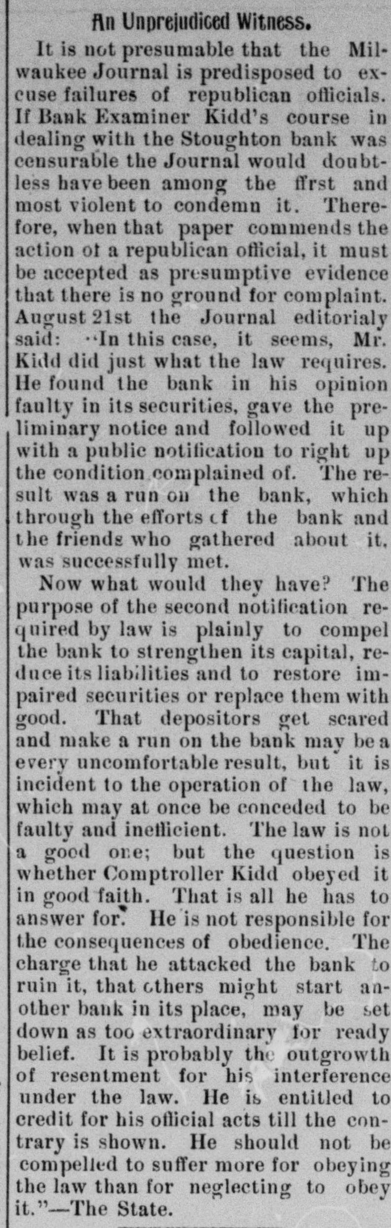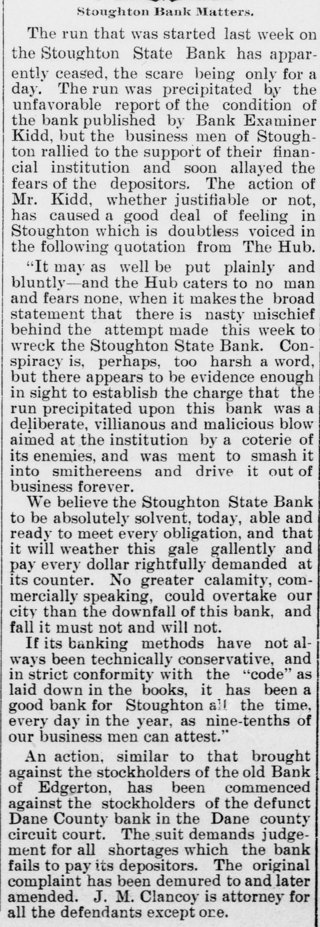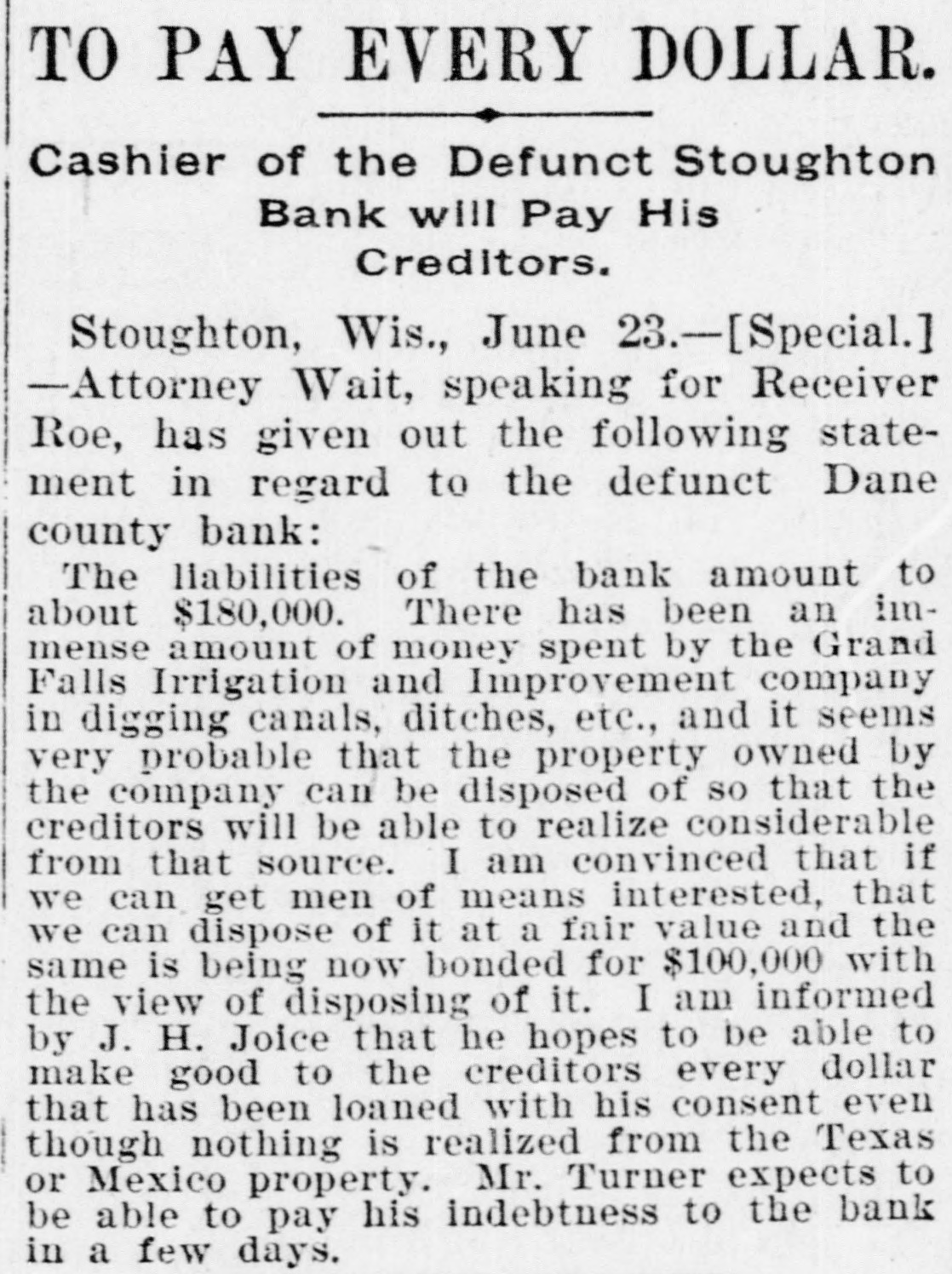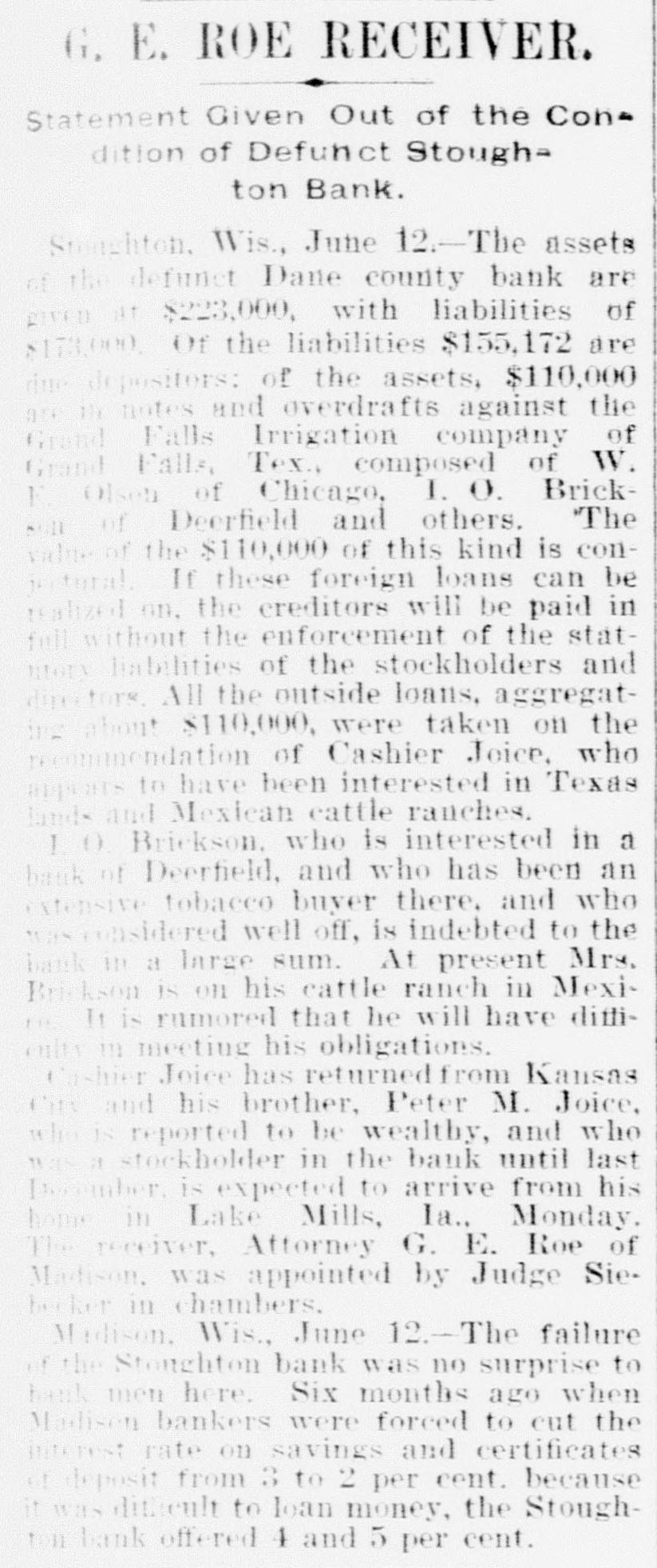 G. E. ROE RECEIVER. Statement Given Out of the Con dition of Defunct Stoughton Bank. Smachton, Wis., June 12.-The assets the defunct Dane county bank are LIVED $223,000, with liabilities of $173,000 Of the liabilities $155,172 are depositors: of the assets, $110,000 17, notes and overdrafts against the Grand Falls Irrigation company of Grand Falls, Tex., composed of W. Olson of Chicago, I.O. Brickof Deerfield and others. The validar of the $110,000 of this kind is congistoral If these foreign loans can be qualized on. the creditors will be paid in full without the enforcement of the stat111011 liabilities of the stockholders and dipators All the outside loans, aggregatin about $110,000. were taken on the recommendation of Cashier Joice, who to have been interested in Texas land= and Mexican eattle ranches. 1 O Brickson. who is interested in a bauk of Deerfield, and who has been an extensive tobacco buyer there. and who www.mosidered well off, is indebted to the bank in a large sum. At present Mrs. Brickson is on his cattle ranch in MexiIt is rumored that he will have diffionly in meeting his obligations. Cashier Joice has returned from Kansas and his brother, Peter M. Joice, reported to be wealthy, and who stockholder in the bank until last number. is expected to arrive from his home in Lake Mills, Ia.. Monday. receiver, Attorney G. E. Roe of Madison. was appointed by Judge Sieposher in chambers. Medison. Wis., June 12.-The failure the Stonghton bank was no surprise to bank men here. Six months ago when Madison bankers were forced to cut the rate on savings and certificates deposit from 3 to 2 per cent. because was dit cult to loan money, the Stough11 bank offered 4 and 5 per cent.