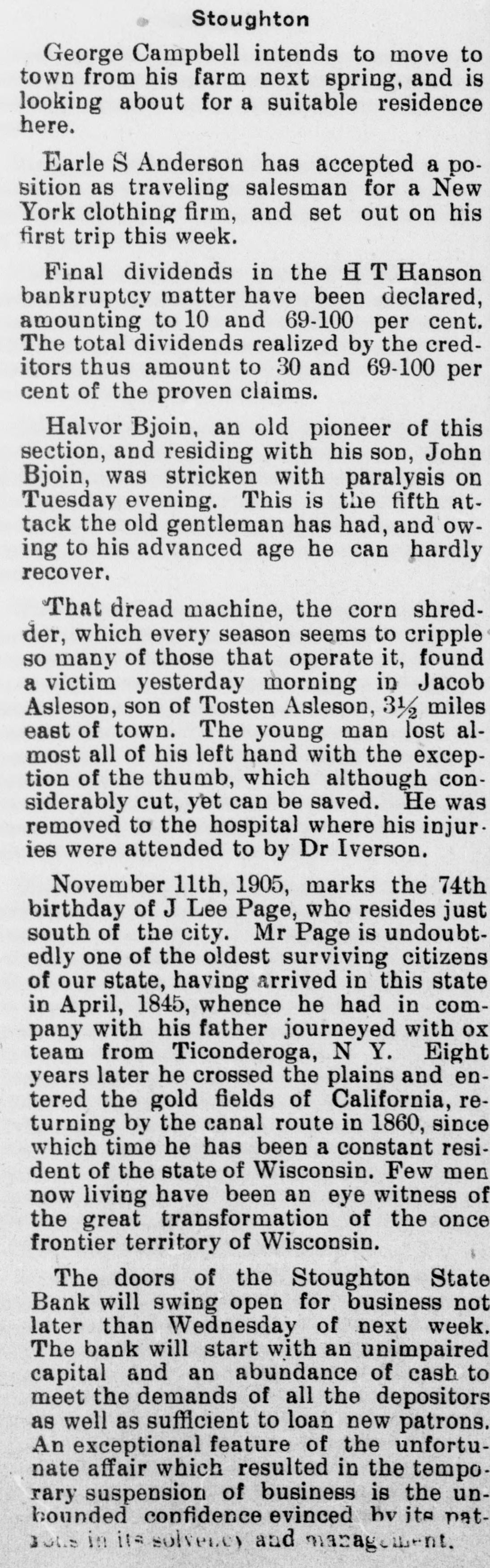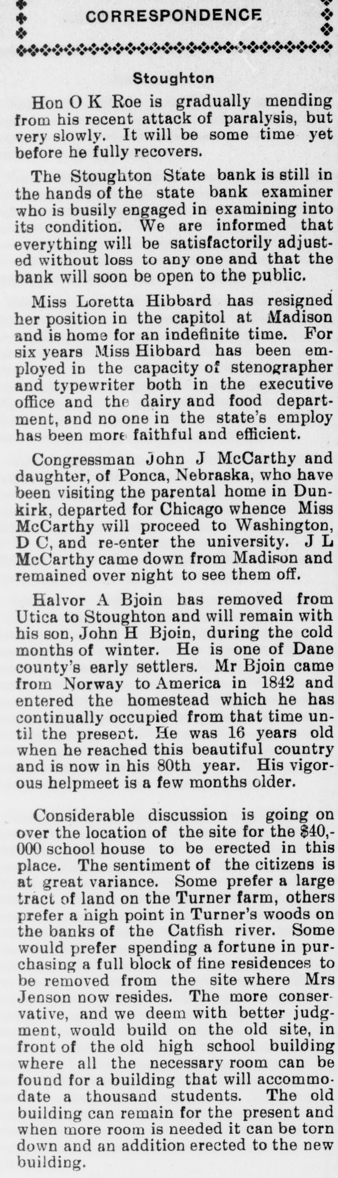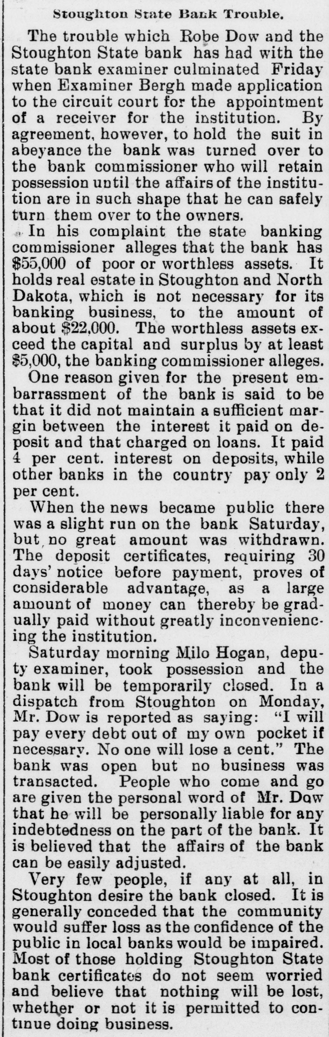 Stoughton State Bank Trouble. The trouble which Robe Dow and the Stoughton State bank has had with the state bank examiner culminated Friday when Examiner Bergh made application to the circuit court for the appointment of a receiver for the institution. By agreement, however, to hold the suit in abeyance the bank was turned over to the bank commissioner who will retain possession until the affairs of the institution are in such shape that he can safely turn them over to the owners. In his complaint the state banking commissioner alleges that the bank has $55,000 of poor or worthless assets. It holds real estate in Stoughton and North Dakota, which is not necessary for its banking business, to the amount of about $22,000. The worthless assets exceed the capital and surplus by at least $5,000, the banking commissioner alleges. One reason given for the present embarrassment of the bank is said to be that it did not maintain a sufficient margin between the interest it paid on deposit and that charged on loans. It paid 4 per cent. interest on deposits, while other banks in the country pay only 2 per cent. When the news became public there was a slight run on the bank Saturday, but, no great amount was withdrawn. The deposit certificates, requiring 30 days' notice before payment, proves of considerable advantage, as a large amount of money can thereby be gradually paid without greatly inconveniencing the institution. Saturday morning Milo Hogan, deputy examiner, took possession and the bank will be temporarily closed. In a dispatch from Stoughton on Monday, Mr. Dow is reported as saying: "I will pay every debt out of my own pocket if necessary. No one will lose a cent." The bank was open but no business was transacted. People who come and go are given the personal word of Mr. Dow that he will be personally liable for any indebtedness on the part of the bank. It is believed that the affairs of the bank can be easily adjusted. Very few people, if any at all, in Stoughton desire the bank closed. It is generally conceded that the community would suffer loss as the confidence of the public in local banks would be impaired. Most of those holding Stoughton State bank certificates do not seem worried and believe that nothing will be lost, whether or not it is permitted to continue doing business.
