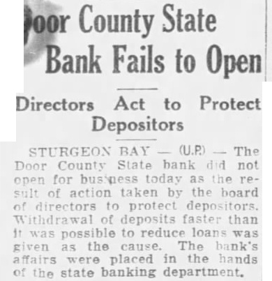 County State Bank Fails to Open Directors Act to Protect Depositors STURGEON BAY (U.P.) The Door County State bank not for today action taken board protect depositors. deposits faster than possible to reduce the cause. The bank's placed in hands the state banking department.