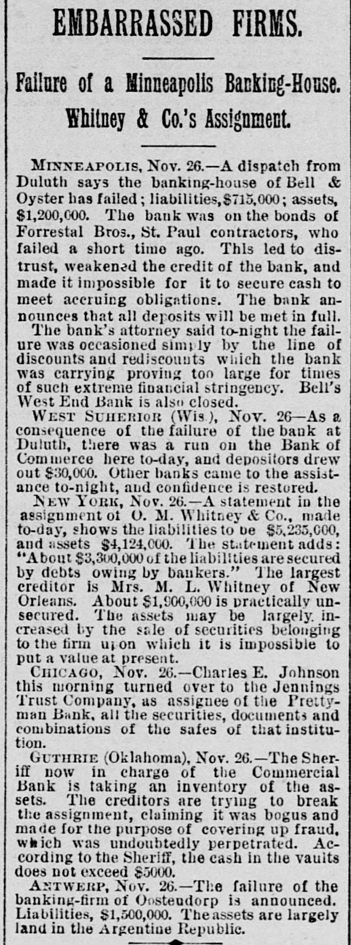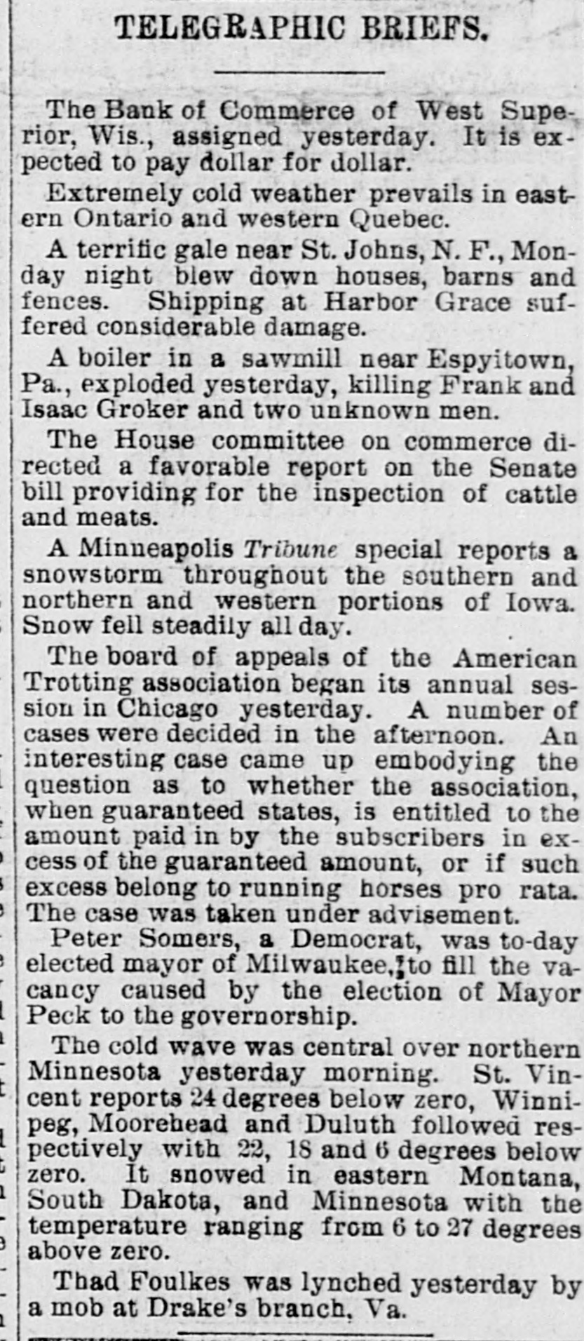DOMESTIC. IN portions of Minnesota the thermometer ranged from 6 to 24 degrees below zero on the 2d and a heavy snowstorm prevailed. THAD FOWLKES, who murdered a of prominent citizen Charlotte County, Va., named Yancey, was lynched at Charlotte. MILLIE PANHORST, who shot and killed Samuel Goldberg, her betrayer, at San Francisco, was acquitted of the charge of murder. Six THOUSAND of the 8,000 coal miners of Alabama struck. EDWARD HOLLAND, a life convict sentenced to Sing Sing (N. Y.) prison in 1878 for murder, was liberated on a pardon from Governor Hill. OVER fifty boats, laden principally with barley and lumber, were reported frozen in on the Erie canal. FIFTY dogs were found dead on the streets at Findlay. O., all of them having met their fate from eating poisoned bologna sausage. of a THE business part Collinwood, suburb of Cleveland, O., was wiped out by fire. FOUR residents of New Haven, Conn., George Herbert, Frank I. Greene, Mr. Case and Mrs. E. E. Turner, who were prospecting in Florida, were drowned in Lake Tohopekaliga by the capsizing of a boat. ; THE Bank of Commerce at West Superior, Wis., suspended, and an assignee was chosen. The assets were given at $640.000 and the liabilities $520,000. ! A WHALE eighty feet in length was seen in Chesapeake bay, off Point Comfort, Md. : IN the Court of Appeals at Albany, N. case of Miss Y., in the Campbell against Arbuckle ("Baby Bunting"), for breach of promise, the judgment of the lower court for $45,000 damages was affirmed. Two MEN entered the office of the Allerton Packing Company at the Stock Yards in Chicago and compelled Cashier Osier to deliver to them a package con;taining $3,200, and then made their escape. AT Oak Ridge, La., four men were shotdead while resisting arrest. / FOUR men were killed by the explosion of a saw-mill boiler near Espytown, Pa. JACKSON FERGUSON, treasurer of Pike County, Ind., was found to be short in :his accounts some $5,000. I MRS. ELIZABETH HOLLENBECK, of San Francisco, gave $750,000 to found a home for indigent women and homeless children in that city. ! THE United States flag-ship Charleston was sighted several miles off the entrance to the harbor in San Francis00, having just arrived from Honolulu with King Kalakaua, of the Hawaiian Islands, aboard. THE question voted upon by all Methodist churches in the United States of admitting women as delegates-to the general conference of that church was decided in favor of the women. THE earnings of the New York-Brooklyn bridge for the past year were $1,239,494; 37,776,411 passengers crossed the structure, of which number 3,222,073 were on foot. AT Sbelbyville, Ind., Mrs. Rucker, wife of J. R. Rucker, and her two children were probably fatally burned by an explosion of natural gas in their residence. AT Seymour, Ind., William C. Bradford, aged 80 years, a one-armed veteran soldier who was partially demented, set fire to his house and perished in the flames. ISAAC M. JORDAN, one of the best known members of the bar in Cincinnati, and a member of Congress from 1885 to 1887, fell down the elevator in the building where his office was located and was instantly killed. A TENEMENT house was burned. in Pittsburgh, Pa., and Mr. and Mrs. 1rvine verished in the flames. 6