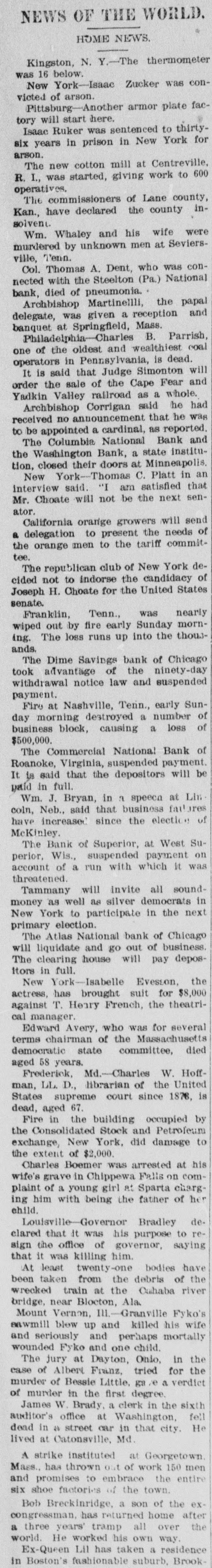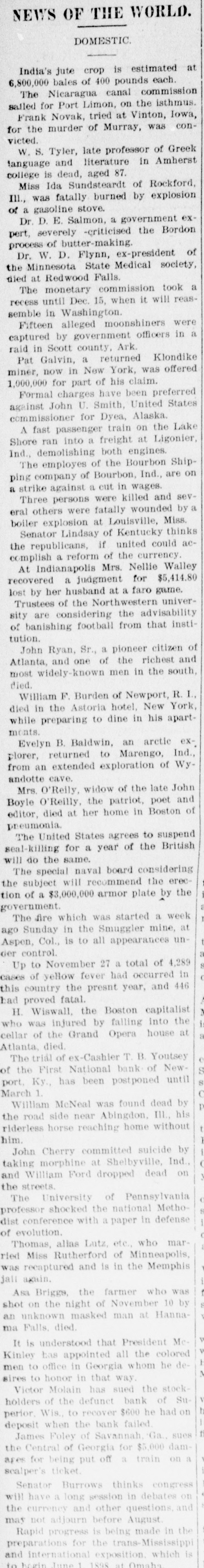 John Ryan, Sr., a pioneer citizen of Atlanta, and one of the richest and most widely-known men in the south, died.