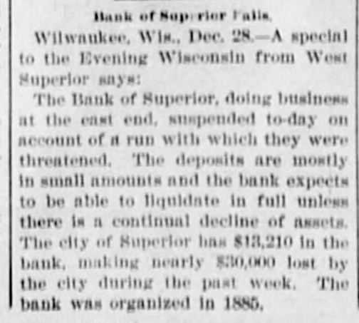Bank of Superior Falls Wilwaukee, Wis., Dec. 28.-A special to the Evening Wisconsin from West Superior says: The Bank of Superior, doing business at the east end. suspended to-day on account of it run with which they were threatened. The deposits are mostly in small amounts and the bank expects to be able to liquidate in full unless there is a continual decline of assets. The city of Superior has $13,210 In the bank, making nearly $30,000 lost by the city during the past week. The bank was organized In 1885.