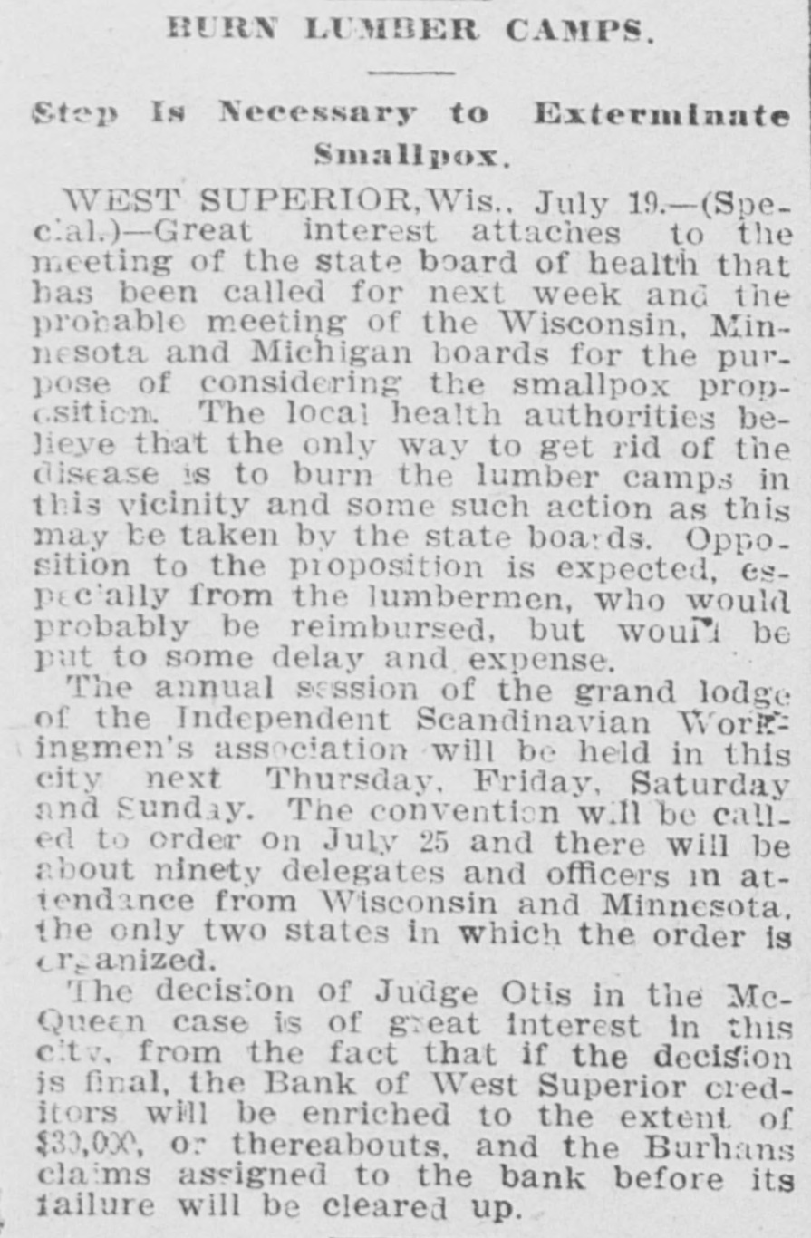BURN LUMBER CAMPS. Step Is Necessary to Exterminate Smallpox. WEST SUPERIOR, Wis., July 19.-(Special.)-Great interest attaches to the meeting of the state board of health that has been called for next week and the probable meeting of the Wisconsin, Minnesota and Michigan boards for the purpose of considering the smallpox proposition. The local health authorities believe that the only way to get rid of the disease is to burn the lumber camps in this vicinity and some such action as this may be taken by the state boards. Opposition to the proposition is expected, especially from the lumbermen, who would probably be reimbursed, but would be put to some delay and expense. The annual session of the grand lodge of the Independent Scandinavian Workingmen's association will be held in this city next Thursday, Friday, Saturday and Sunday. The convention will be called to order on July 25 and there will be about ninety delegates and officers in attendance from Wisconsin and Minnesota, the only two states in which the order is organized. The decision of Judge Otis in the McQueen case is of great interest in this city, from the fact that if the decision is final, the Bank of West Superior creditors will be enriched to the extent of $33,000, or thereabouts, and the Burhans claims assigned to the bank before its failure will be cleared up.