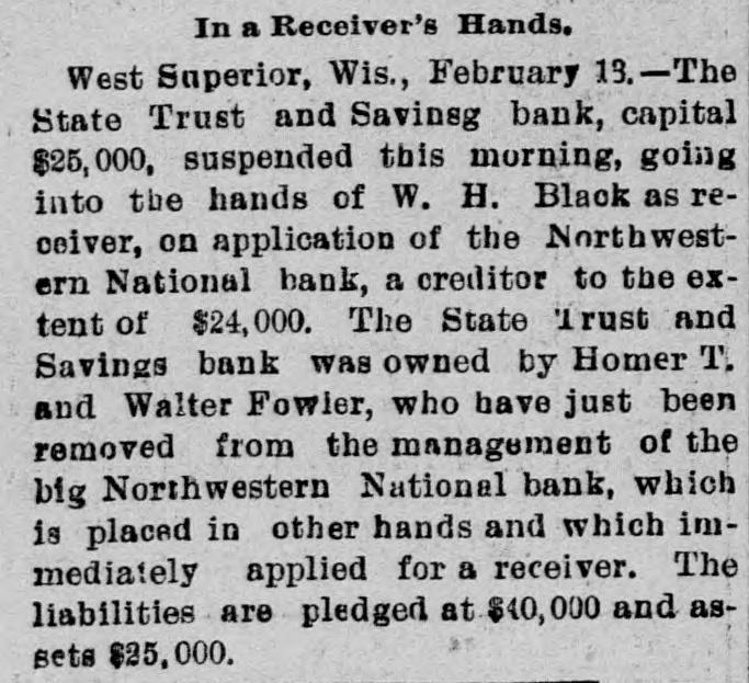The State Trust and Savings Bank. capital $25,000, of West Superior, Wis., suspended. Saturday, going into the hands of W. H. Slack as receiver, on application of the Northwestern National Bank, a creditor to the extenţ of $24,000. The State Trust and Savings Bank was owned by Homer T. and Walter Fowler, who have just been removed from the management of the big Northwestern National Bank, which is placed in other hands and which immediately applied for a receiver. The liabilities are placed at $40,000 and assets $25,000, but the bank's books show $78,000 liabilities and some assets in which the Northwestern National is the only secured creditor. The bank had sustained a run for weeks and had only $200 left.