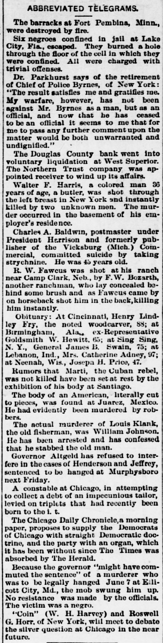 ABBREVIATED TELEGRAMS. The barracks at Fort Pembina, Minn., were destroyed by fire. Six negroes confined in jail at Lake City, Fla., escaped. They burned a hole through the floor of the cell in which they were confined. All were charged with trivial offenses. Dr. Parkhurst says of the retirement of Chief of Police Byrnes, of New York: "The result satisfies me and gratifies me. My warfare, however, has not been against Mr. Byrnes as a man, but as an official, and now that he has ceased to be an official it seems to me that for me to pass any further comment upon the matter would be both unwarranted and undignified." The Douglas County bank went into voluntary liquidation at West Superior. The Northern Trust company was appointed receiver to wind up its affairs. Walter F. Harris, a colored man 36 years of age, a butler, was shot through the left breast in New York and instantly killed by two unknown men. The murder occurred in the basement of his employer's residence. Charles A. Baldwin, postmaster under President Harrison and formerly publisher of the Vicksburg (Mich.) Commercial, committed suicide by taking strychnine. He was 45 years old. R. W. Fawcus was shot at his ranch near Camp Clark, Neb., by F.W. Bozarth, another ranchman, who lay concealed behind some brush and as Fawcus came by on horseback shot him in the back, killing him instantly. Obituary: At Cincinnati, Henry Lindley Fry, the noted woodcarver, 88; at Birmingham, Ala., ex-Representative Goldsmith W. Hewitt. 65; at Sing Sing, N. Y., General James B. Swain, 75; at Lebanon, Ind., Mrs. Catherine Adney, 97; at Neenah, Wis., Joseph H. Price, 47. Rumors that Marti, the Cuban rebel, was not killed have been set at rest by the exhibition of his body at Santiago. The body of an American, literally cut to pieces, was found at Juarez, Mexico. He had evidently been murdered by robbers. The actual murderer of Louis Klank, the old fisherman, was William Johnson. He has been arrested and has confessed that he stabbed the old man. Governor Altgeld has refused to interfere in the cases of Henderson and Jeffrey, sentenced to be hanged at Murphysboro next Friday. A constable at Chicago, in attempting to collect a debt of an impecunious tailor, levied on triplets that had recentiy been born to the i. t. The Chicago Daily Chronicle,a morning paper, proposes to supply the Democrats of Chicago with straight Democratic doctrine, and the party with an organ, which it has been without since The Times was absorbed by The Herald. Because the governor "might have commuted the sentence" of a murderer who was to be legally hanged June 7 at Ellicott City, Md., the mob swung him up. No resistance was made by the officials. The victim was a negro. "Coin" (W. H. Harvey) and Roswell G. Horr. of New York, will meet to debate the silver question at Chicago in the near future.