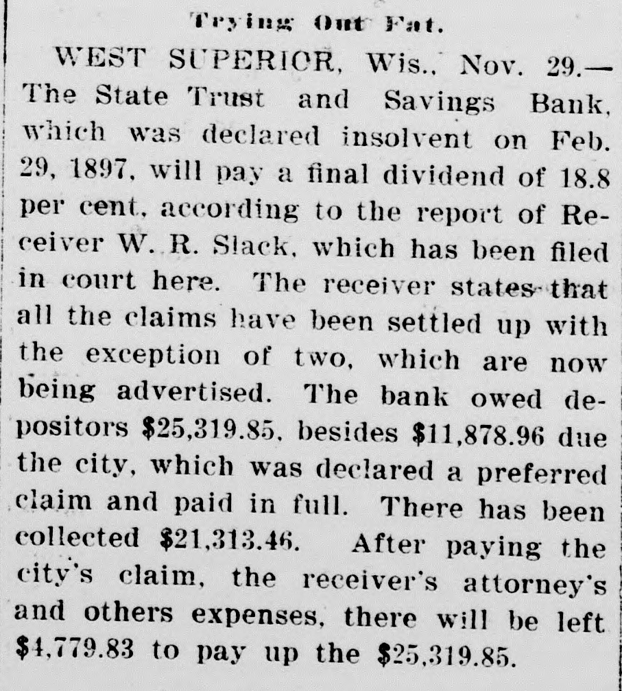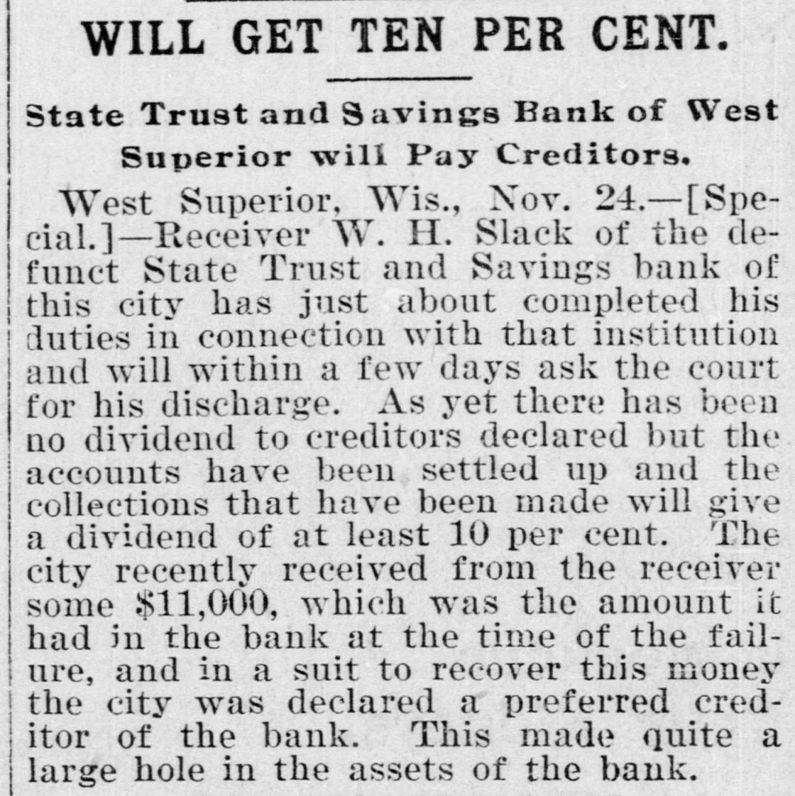 WILL GET TEN PER CENT. State Trust and Savings Bank of West Superior will Pay Creditors. West Superior, Wis., Nov. 24.-[Special.]-Receiver W. H. Slack of the defunct State Trust and Savings bank of this city has just about completed his duties in connection with that institution and will within a few days ask the court for his discharge. As yet there has been no dividend to creditors declared but the accounts have been settled up and the collections that have been made will give a dividend of at least 10 per cent. The city recently received from the receiver some $11,000, which was the amount it had in the bank at the time of the failure, and in a suit to recover this money the city was declared a preferred creditor of the bank. This made quite a large hole in the assets of the bank.