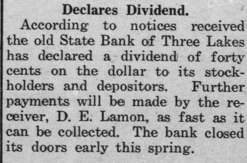 Declares Dividend. According to notices received the old State Bank of Three Lakes has declared a dividend of forty cents on the dollar to its stockholders and depositors. Further payments will be made by the receiver, D. E. Lamon, as fast as it can be collected. The bank closed its doors early this spring.