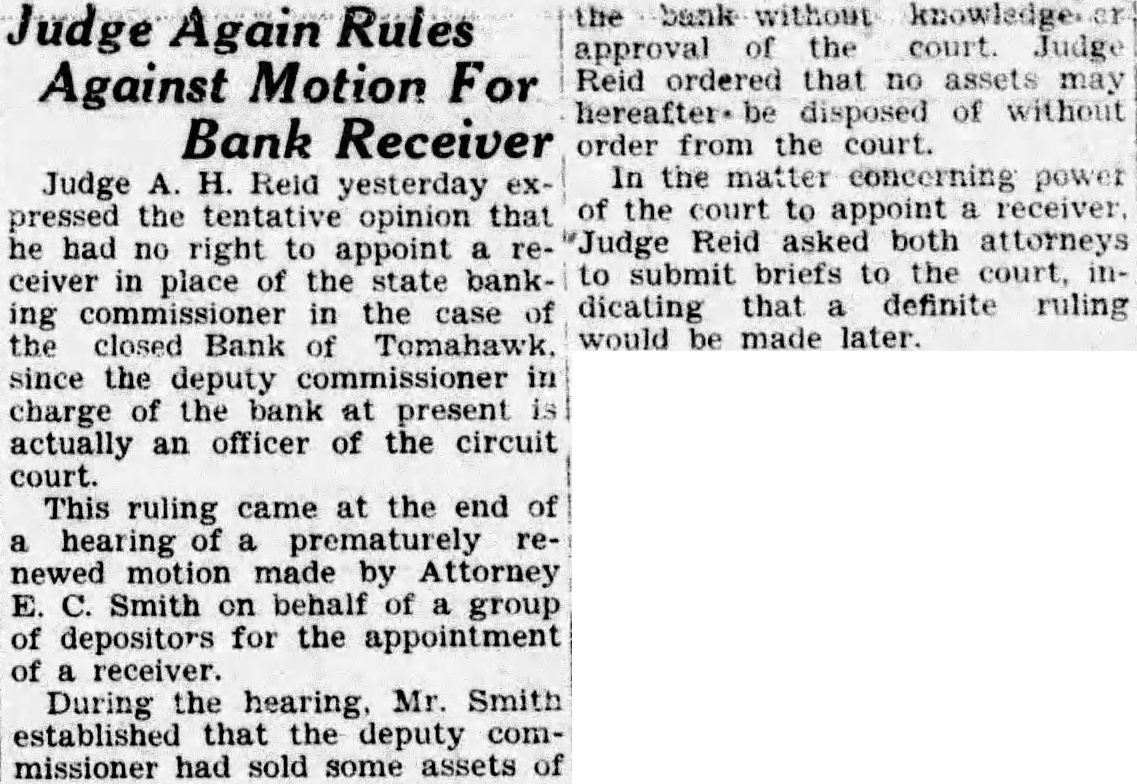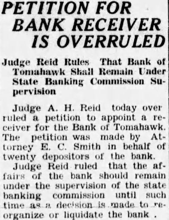 PETITION FOR BANK RECEIVER IS Judge Reid Rules That Bank of Tomahawk Shall Remain Under State Banking Commission Supervision Judge Reid today over ruled ceiver for the Bank The was made by AtSmith in behalf torney twenty depositors the Judge Reid ruled that affairs the bank should remain under supervision of the state banking commission until such time decision made organize or liquidate the bank