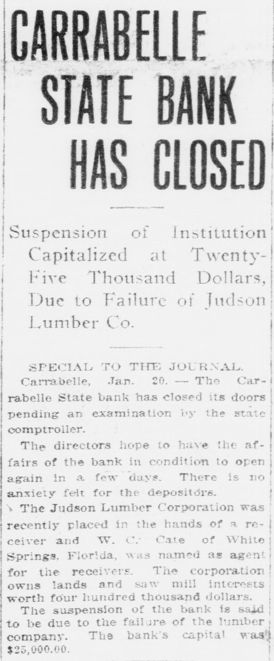 CARRABELLE STATE BANK HAS CLOSED Suspension of Institution Capitalized at TwentyFive Thousand Dollars, Due to Failure of Judson Lumber Co. SPECIAL TO THE JOURNAL Carrabelle, Jan. 20. - The Carrabelle State bank has closed its doors pending an examination by the state comptroller. The directors hope to have the affairs of the bank in condition to open again in a few days. There is no anxiety felt for the depositors. The Judson Lumber Corporation was recently placed in the hands of a receiver and W. C. Cate of White Springs, Florida, was named as agent for the receivers. The corporation owns lands and saw mill interests worth four hundred thousand dollars. The suspension of the bank is said to be due to the failure of the lumber company. The bank's capital was $25,000.00.