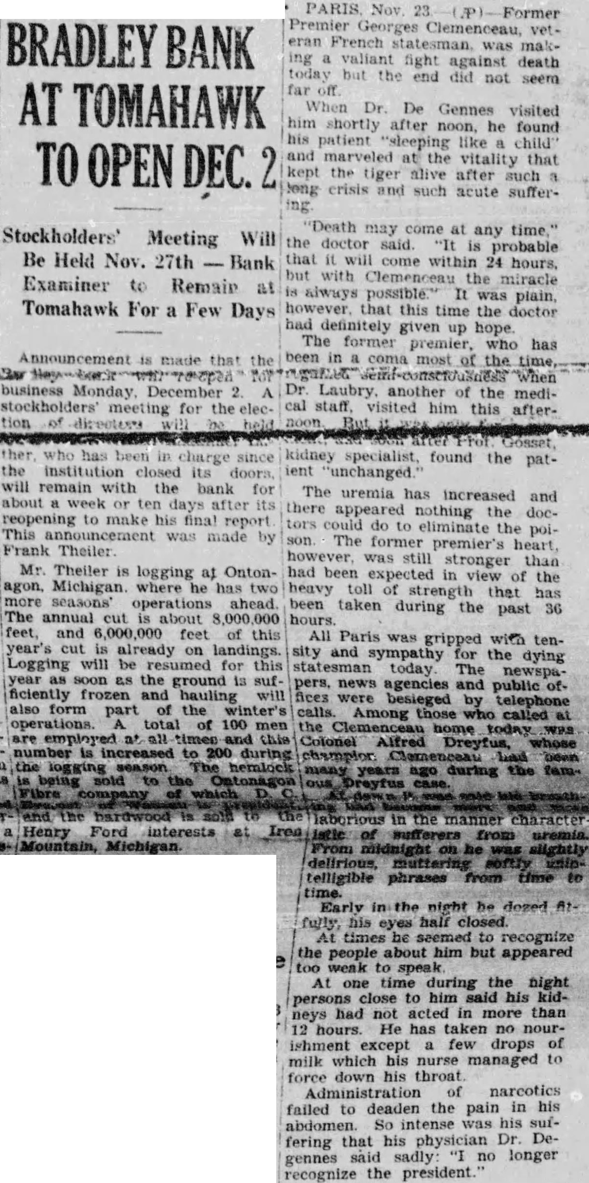 BRADLEY BANK AT TOMAHAWK Stockholders' Will Meeting Be Held Nov. Bank Examiner to Remain at Tomahawk For a Few Days made that the business December meeting for the elec- has been charge the institution closed doors, will remain the bank for about or ten days after its reopening to make his final report This was made Frank Theiler Mr. Theiler is logging at Ontonagon, Michigan. where has operations ahead annual cut about and 6,000,000 feet of this year's already on landings. Logging for soon as the ground is sufficiently frozen and hauling will form part the winter's total 100 all and this to 200 during season Henry Ford interests Michigan Georges Clemenceau, French was valiant fight death against today but end did not seem When Dr. De Gennes visited him shortly after noon, he found his patient like child" and marveled vitality that kept the tiger alive after such long crisis and such acute suffering Death may come at any the doctor said. probable that come within 24 hours, but with Clemenceau the miracle always It was plain, however. that this time the doctor had definitely given up hope. The former premier, who has been in coma most the when Dr. Laubry. another of the medical visited him this kidney specialist, found the ient "unchanged. The uremia has increased and there appeared nothing doccould do to eliminate the poiThe former premier's heart, however, was still stronger than had been expected in view of the heavy toll of strength that has been taken during the past hours All Paris was gripped with tensity and sympathy for the dying statesman today. The news agencies and public were besieged telephone Among those called the today Colonel Alfred Dreyfus, years during the of he telligible phrases Early night be dozed fully, his eyes half times seemed to recognize the people about him but appeared weak to speak At time during the night persons close to him said his kidneys had not acted in more than hours. He has taken no nourishment except few drops milk which his nurse managed to force down his throat Administration narcotics failed deaden the pain in his abdomen So intense his suffering that his physician Dr. Degennes sadly no longer recognize the president.
