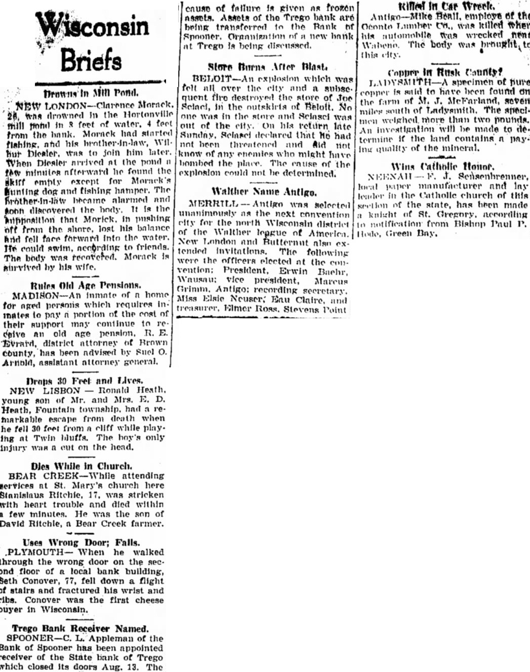 Wisconsin Briefs Drowns In Mm Pond. NEW LONDON-Clarence Morack. 26. was drowned In the Hortonville mill pond in R feet of water. feet from the bank. Morack had started hur Diester. was to join him later. When Diesler arrived at the pond 11 few minutes afterward he found the skirf empty except for Mornek's Nunting dog and fishing hamper. The Boon discovered the hody. It is the Autoposition that Morick. in pushing off from the shore, lost his balance and fell face forward Into the water. He could swim, necording to friends. The body was recovered. Morack is survived by his wife. Rules Old Age Pensions. MADISON-An inmate of n home for nged persons which requires inmates to pay portion of the cost of their support may continue to redeive an old age pension. R. E. Evrard, district attorney of Brown county, has been advised by Suel O. Arnold, assistant attorney general. Drops 30 Feet and Lives. NEW LISBON Ronald Health. young son of Mr. and Mrs. E. D. Heath, Fountain township. had a re. markable escape from death when he fell 30 feet from cliff while play. 1hg at Twin bluffs. The hoy's only injury WAR n cut on the head. Dies While in Church. BEAR CREEK-While attending services nt St. Mary's church here Stanislaus Ritchie, 17. was stricken with heart trouble and died within a few minutes. He was the son of David Ritchle, a Bear Creek farmer. Uses Wrong Door; Falls. PLYMOUTH- When he walked through the wrong door on the sec. ond floor of R local bank building, Seth Conover, 77, fell down flight of stairs and fractured his wrist and ribs. Conover was the first cheese buyer in Wisconsin. Trego Bank Receiver Named. SPOONER-C. L. Appleman of the Bank of Spooner has been appointed receiver of the State bank of Trego which closed its doors Aug. 13. The cause of failure is given AR frozen assets. Assets of the Trego bank are being transferred to the Bank of Spooner. Organization of a new bank at Trego is being discussed. Store Burns After Blast. BELOIT- explosion which was felt all over the city and a subsc. quent fire destroyed the store of Joe Scinci, in the outskirts of Beloft. No one was in the store and Scinsel was out of the city. On his return Into not been threatened and Aid not know of any enemies who might have bombed the place. The cause of the explosion could not he determined. Walther Name Antigo. MERRILL Antigo was selected unanimously ns the next convention city for the north Wisconsin district of the Walther leggue of America. New London and Butternut also ex. tended Invitations. The following were the officers elected nt the convention: President. Erwin Baehr, Wausau: vice president, Marcus Grimm. Antigo: recording secretary. Miss Elsie Neuser: Eau Claire, and treasurer, Elmer Ross. Stevens Point Antigo-Mike Beall. employe of the Oconte Lumber CA., was killed when his automobile this wrecked nent Wabeno. The body was brought td this city. Copper In Rusk County? LADYSMIT specimen of nure copper is said to have been found on the farm of M. J. McFarland, seven miles south of Ladysmith. The specimen weighed more than two pounds. An investigation will be made to de. termine If the land contains n pay. Ing quality of the mineral. Wins Catholic Honor. NEENAH F. J. Sensenbrenner. local paper manufacturer and Iny leader in the Catholle church of this section of the state, has been made a knight of St. Gregory. necording to notification from Bishop Paul P. Hode, Green Bay.