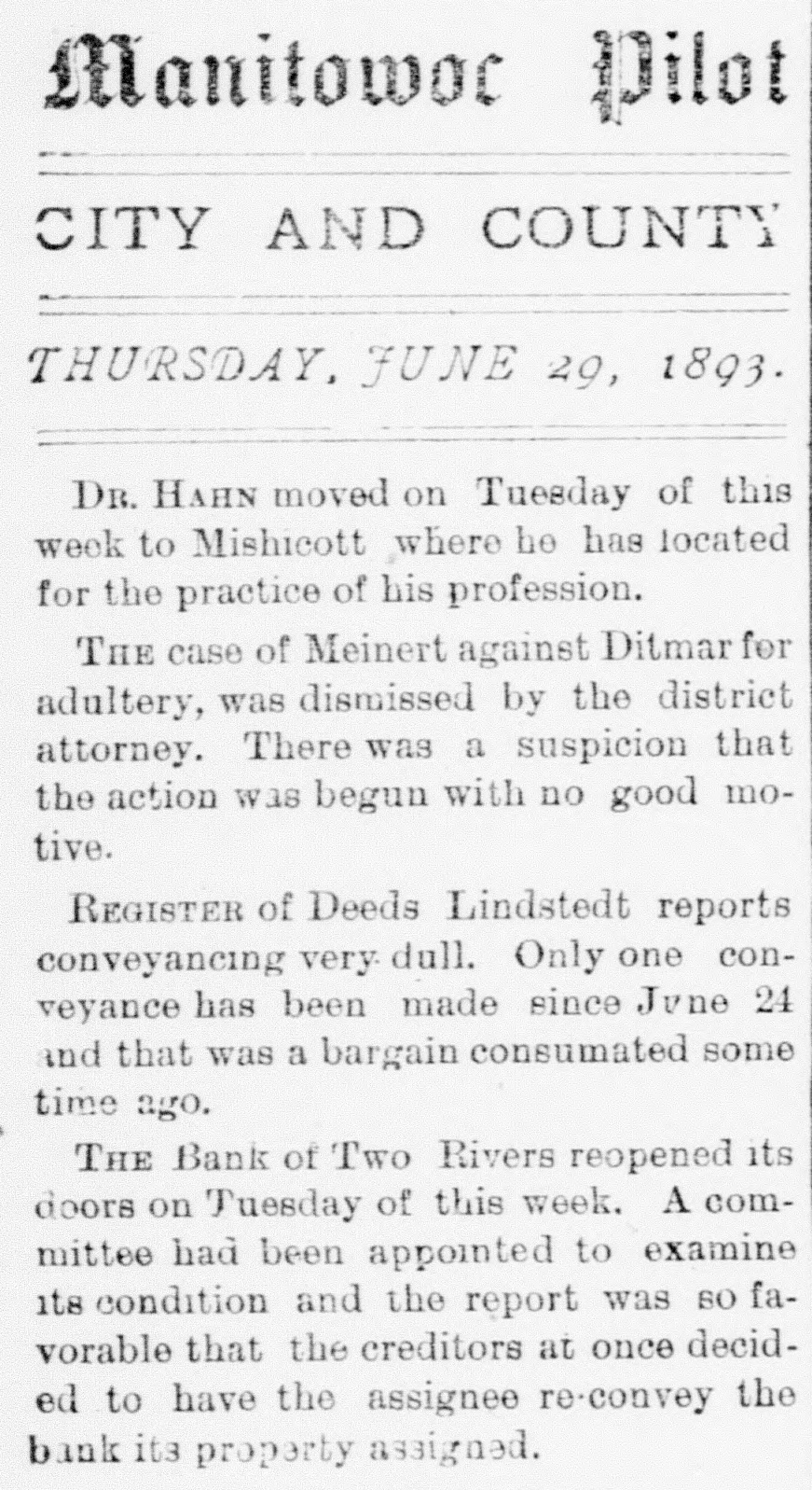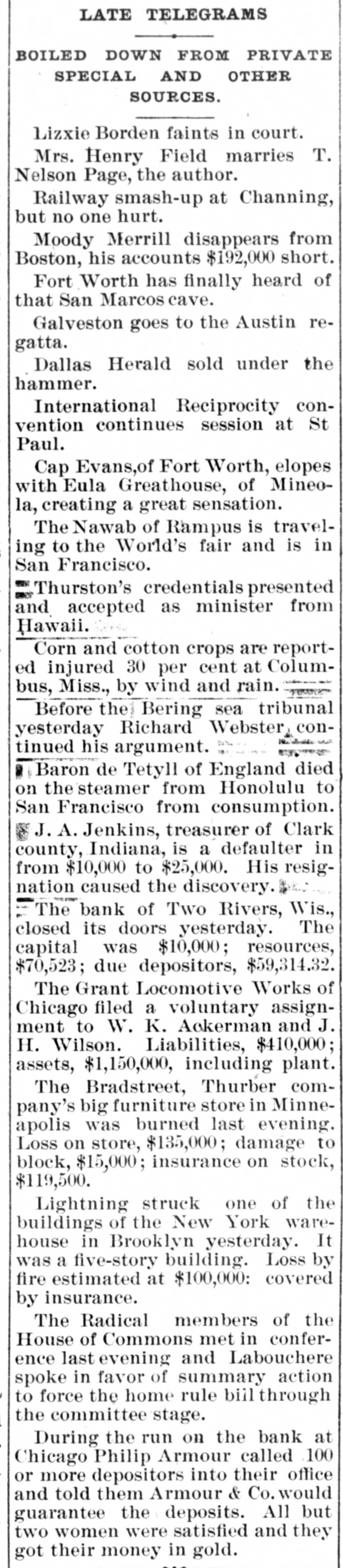 MANY SMALL BANKS GO DOWN. UNDUE EXPANSION THE CAUSE IN ONE CASERUNS RESPONSIBLE IN OTHERS. Toledo, Ohio, June 6.-A dispatch to "The Blade" from Defiance, Ohio, says that the doors of the Deliance Savings Bank closed yesterday afternoon just before 3 o'clock. This was done by the assignee, Rolla H. Gleason. Many of the stockholders did not know that any such step was in contemplation. The bank is the youngest in the town, and has a paid up capital of $27,000. The assets will reach not less than $150,000, and the liabilities are stated at $100,000. The failure is attributed to large loans made by the bank, which ties up some $127,000, leaving them too narrow a working capital. Andrew Sauer, the cashier, assigned his entire real and personal property amounting to $100,000, Frank S. Smith being his assignee. The enterprises In which Mr. Sauer is Interested. all of which are Included in his assignment, are the Deflance Electric Street Railway, electric light plant and gas works, the Citizens' Opera House, valued at $50,000, besides considerable real estate. The Golden Rule Drygoods House, in which he was Interested with a stock valued at 42,000, was turned over to Henry Smith and Henry Foos, two of his heaviest creditors. Manitowor, Wis., June 6.-The State Bank of ManItowoc did not open for business this morning. There has been a continued run on the Institution for the last three weeks, and the officers have made a fight against the failure which by developments yesterday was made inevitable. C. C. Barnes, the president, It is understood, has turned over all his personal property to cover any possible loss by depositors. The bank's capital stock was $50,000 and the surplus $10,000. The Manitowoe Savings Bank is experiencing a light run. Reports from Racine say a run is in progress on the Manufacturers' National Bank. At Madison the run on the First National Bank has increased in vigor, while other banks are having Increased demands. Spokane, Wash., June 6.-The Washington National Bank and Its adjunct, the Washington Savings Bank, closed their doors this morning. They were crippled by the quiet run yesterday. Both show strong assets, much in Increase of the liabilities, but could not get money in time for the sudden demand. The other banks are being subjected to a severe run, but seem to be standing the strain well. Two Rivers, Wis., June 6.-The bank of Two Rivers closed its doors this morning. It was capitalized at $10,000. Its resources according to the last state. ment were $70,523, and amount due depositors, $59,314 32. Philadelphia, June 6.-Cornellus & Rowland, dealers in gas fixtures, at No. 1,512 Chestnut-st. have made an assignment. Liabilities are estimated at $50,000, and assets at $75,000.