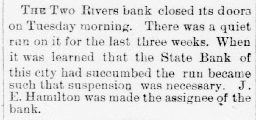 THE Two Rivers bank closed its doora on Tuesday morning. There was a quiet run on it for the last three weeks. When it was learned that the State Bank of this city had succumbed the run became such that suspension was necessary. J. E. Hamilton was made the assignee of the bank.