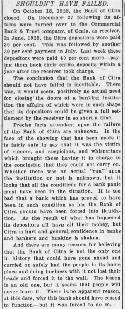 On October 1928, the Bank of Citra closed. December following fairs turned over to the Commercial Bank Trust of Ocala, receiver. company, June, the Citra depositors were paid per cent. This followed by another cent payment July. Last week these depositors were paid per cent them back their entire deposits within the receiver took charge. The conclusion that the Bank of Citra should not have failed inevitable. There would seem, positively no actual need for closing' doors of banking instituthe affairs which were in such shape that its could be given full tlement the receiver short time. Precise facts upon the failure the Bank of Citra are unknown. the face of the showing that has been made fairly safe say that victim rumors, and suspicions, and whisperings which brought those charge the conclusion that they could not carry Whether there was an actual upon the institution or unknown, but that all the conditions for bank panic have been the situation. too that bank which has proved have been such condition has the Bank of should have been forced into tion. As the result what happened depositors all have all their money, but Citra hurt and general confidence banks bankers and banking shaken. And there many reasons for believing that the Bank of Citra not the only one history that could have gone ahead and carried safely had the people its home and doing business with not lost their place heads and forced to the wall. The lesson old but seems that people will learn There apparent reason, this date, should forced do