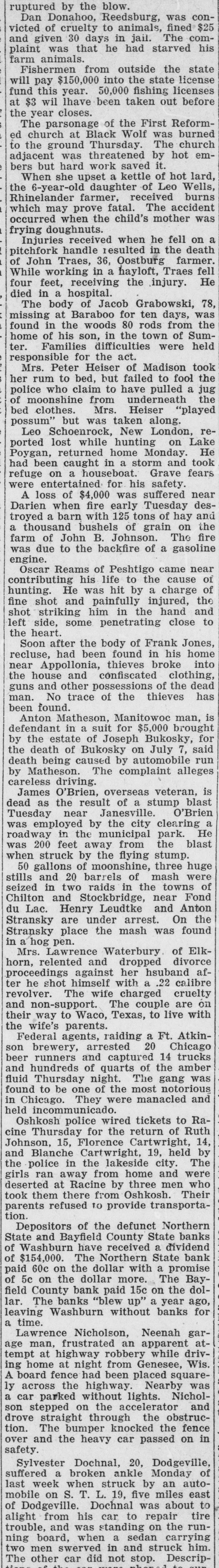NEWS OF THE BADGER STATE Mrs. Wilhelmina Giese, 69, a pioneer of Oconto, died suddenly while reading the evening paper at her home. John Grayearek, 50, a farmer of Zander, Wis., committed suicide by hanging. His body was found suspended from an apple tree in his orchard. Milk dealers of La Crosse increased the retail price of milk from 11 to 12 cents. The raise is due to the dry summer and scarcity of feed, the La Crosse Milk Producers' association announced. Henry E. Krause, who for many years had followed the lumber industry in northern Wisconsin, died in Rhinelander where he had lived for the last thirty-five years. Cancer was the cause of death. The Bayfield County bank and the Northern State bank, both of Washburn, have been taken over by the state bank department, Dwight Parker, commissioner of banking, announced. Frozen assets were attributed as the reason for taking over the institutions. Joseph H. Carnahan of Black River Falls was seriously injured when he was struck by an automobile near his home. He had gotten out of his car, leaving it with the driver, and went around the back of the car and stepped into the street in front of an approaching automobile. A verdict of accidental death was returned by a coroner's jury after an inquest into the killing of Louis Keiferle, run down by an automobile driven by Ed Hicken, a Fond du Lac county farmer. Hicken was freed of any blame in the accident. Keiferle's death resulted from nine broken ribs, one of which punctured one of his lungs. The state is faced with the possibility of paying an advance of five cents a barrel on cement for next year's highway construction. Last year's supply of 1,600,000 barrels of cement was purchased at $1.70 a barrel. Illinois has just rejected its best bid of $1.75 a barrel, and there is little hope of a drop in cement with the state to ask for bids about Jan. 4. Wisconsin banks show a healthy and improved financial condition at the present time compared with last year, according to a statement of the condition of all state banks, issued by State Bank Commissioner Dwight Parker. The statement covers business up to Nov. 7. The eight hundred forty-seven banks included in the statement have total insources of $584,588,196, the report shows. Postal authorities are preparing for the biggest holiday rush in the history of the postal sevice. "The entire mail service is at present working at utmost capacity on everyday mail-the holiday rush has not yet started," said Peter F. Piasecki, Milwaukee postmaster. "Regular correspondence and advertising is extremely heavy this month, which leaves but little leeway for holiday mail. The postal service will need fully ten days to handle the Christmas mail. Therefore all greetings and gifts should be mailed before December 15." James G. Monahan, former congressman, long leader among Wisconsin Republicans, and a prominent Mason, died December 5th, at Dubupue, Iowa, after he had been taken suddenly ill at his hotel. Mr. Monahan had appeared to be in his usual health, when he left Darlington on a business trip to the Iowa city. Te was 68. For 40 years a leader of the Republican party in Wisconsin, particularly in the southwestern counties, Mr. Monahan achieved his most notable political triumph in 1918, when he was elected to congress in the second district, defeating John M. Nelson, Madison, who held the seat for several terms, and who regained it in 1920. Edward J. Sailstad, former president of the Multitone Phonograph campany, of Eau Claire, supposed to have burned to death in a cottage fire at Lake Nebagamon, a resort south of Superior, Aug. 26, 1920, has been located and arrested at Napa, Cal., and will be brought back to Wisconsin to face charges of arson and unlawful disinterment of a body. In his purported confession, Sailstad told how he had exhumed the body of Allen McFee in Lake Nebagamon cemetery, placing it in the cottage he had rented, and then burning the dwelling in an effort to leave the impression that he, Sailstad, had perished. After his disappearance he in company with