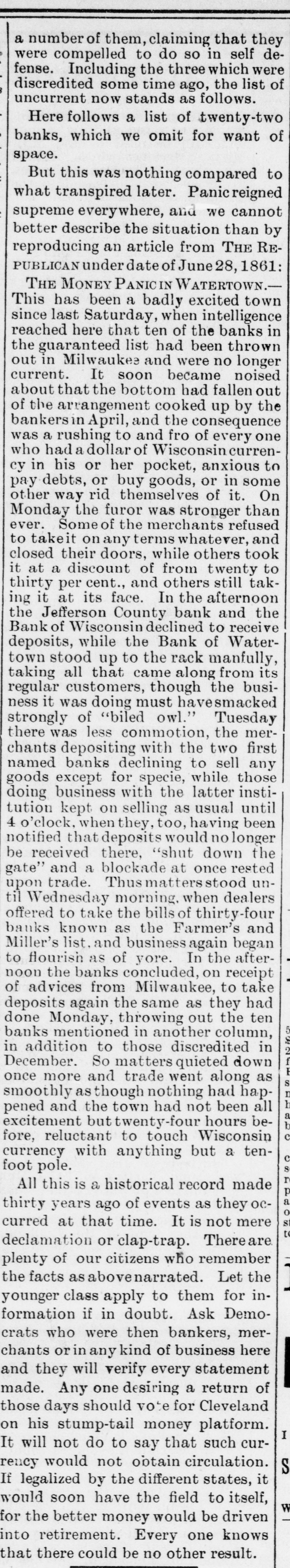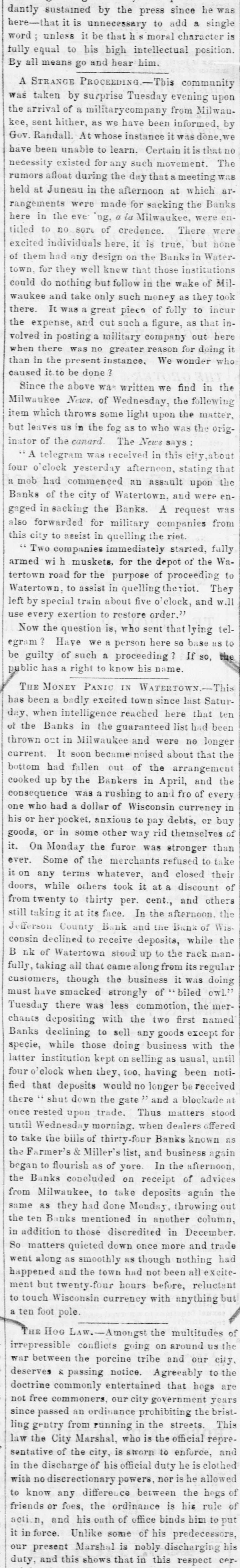 dantly sustained by the press since he was here that it is unnecessary to add a single word; unless it be that his moral character is fully equal to his high intellectual position. By all means go and hear him. # A STRANGE PROCEEDING. This community was taken by surprise Tuesday evening upen the arrival of a militarycompany from Milwau- kee, sent hither, as we have been informed, by Gov. Randall. At whose instance it was done, we have been unable to learn. Certain it is that no necessity existed for any such movement. The rumors afloat during the day that a meeting was held at Juneau in the afternoon at which ar- rangements were made for sacking the Banks here in the eve 'ng, a la Milwaukee, were en- titled to no sort of credence. There were excited individuals here, it is true, but none of them had any design on the Banks in Water- town, for they well knew that those institutions could do nothing but follow in the wake of Mil- waukee and take only such money as they took there. It was a great piece of folly to incur the expense, and cut such a figure, as that in- volved in posting a military company out here when there was no greater reason for doing it than in the present instance. We wonder who caused it to be done? Since the above was written we find in the Milwaukee News, of Wednesday, the following item which throws some light upon the matter, but leaves us in the fog as to who was the orig- inator of the canard. The News says: "A telegram was received in this city, about four o'clock yesterday afternoon, stating that a mob had commenced an assault upon the Banks of the city of Watertown, and were en- gaged in sacking the Banks. A request was also forwarded for military companies from this city to assist in quelling the riot. "Two companies immediately started, fully armed with muskets, for the depot of the Wa- tertown road for the purpose of proceeding to Watertown, to assist in quelling the riot. They left by special train about five o'clock, and will use every exertion to restore order." Now the question is, who sent that lying tel- egram? Have we a person here so base as to be guilty of such a proceeding? If so, the public has a right to know his name. # THE MONEY PANIC IN WATERTOWN. This has been a badly excited town since last Satur- day, when intelligence reached here that ten of the Banks in the guaranteed list had been thrown out in Milwaukee and were no longer current. It soon became noised about that the bottom had fallen out of the arrangement cooked up by the Bankers in April, and the consequence was a rushing to and fro of every one who had a dollar of Wisconsin currency in his or her pocket, anxious to pay debts, or buy goods, or in some other way rid themselves of it. On Monday the furor was stronger than ever. Some of the merchants refused to take it on any terms whatever, and closed their doors, while others took it at a discount of from twenty to thirty per. cent., and others still taking it at its face. In the afternoon. the Jefferson County Bank and the Bank of Wis- consin declined to receive deposits, while the Bnk of Watertown stood up to the rack man- fully, taking all that came along from its regular customers, though the business it was doing must have smacked strongly of "biled owl." Tuesday there was less commotion, the mer- chauts depositing with the two first named Banks declining to sell any goods except for specie, while those doing business with the latter institution kept on selling as usual, until four o'clock when they, too, having been noti- fied that deposits would no longer be received there "shut down the gate" and a blockade at once rested upon trade. Thus matters stood until Wednesday morning, when dealers offered to take the bills of thirty-four Banks known as the Farmer's & Miller's list, and business again began to flourish as of yore. In the afternoon, the Banks concluded on receipt of advices from Milwaukee, to take deposits again the same as they had done Monday, throwing out the ten Banks mentioned in another column, in addition to those discredited in December. So matters quieted down once more and trade went along as smoothly as though nothing had happened and the town had not been all excite- ment but twenty-four hours before, reluctant to touch Wisconsin currency with anything but a ten foot pole. # THE HOG LAW. Amongst the multitudes of irrepressible conflicts going on around us the war between the porcine tribe and our city, deserves & passing notice. Agreeably to the doctrine commonly entertained that hogs are not free commoners, our city government years since passed an ordinance prohibiting the brist- ling gentry from running in the streets. This law the City Marshal, who is the official repre- sentative of the city, is sworn to enforce, and in the discharge of his official duty he is clothed with no discrectionary powers, nor is he allowed to know any difference between the hegs of friends or foes, the ordinance is his rule of action, and his oath of office binds him to put it in force. Unlike some of his predecessors, our present Marshal is nobly discharging his duty, and this shows that in this respect cer-