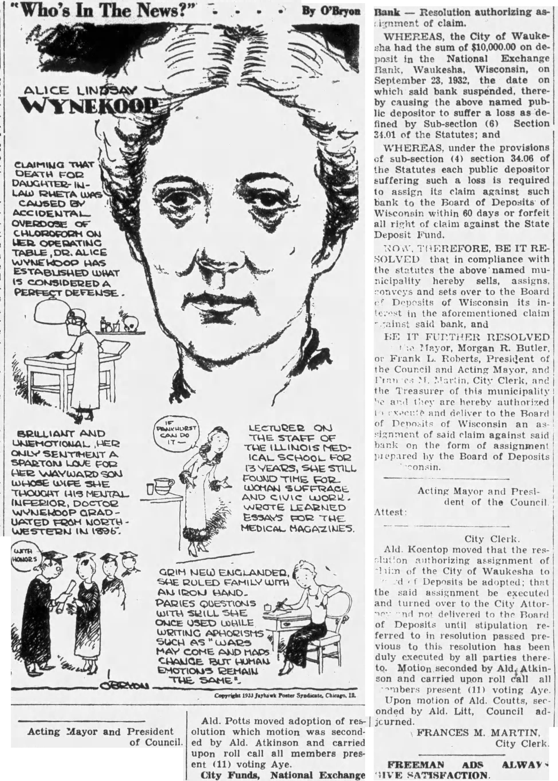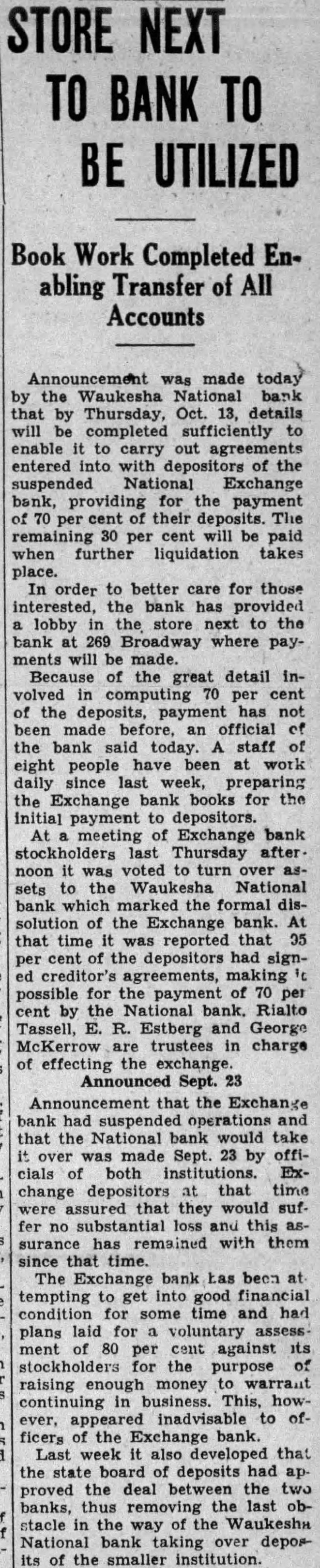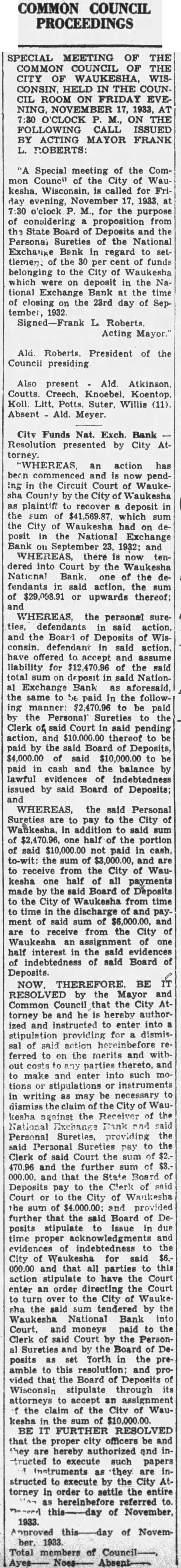 "A Special meeting of the Common Counc" of the City of Waukesha, Wisconsin, is called for Friday evening, November 17, 1933, at 7:30 o'clock P. M., for the purpose of considering proposition from the State Board of Deposits and the Personal Sureties of the National Exchange Bank in regard to settlemen. of the 30 per cent of funds belonging to the City of Waukesha which were on deposit in the National Exchange Bank at the time of closing on the 23rd day of September, 1932 Signed-Frank L. Roberts Acting Mayor.