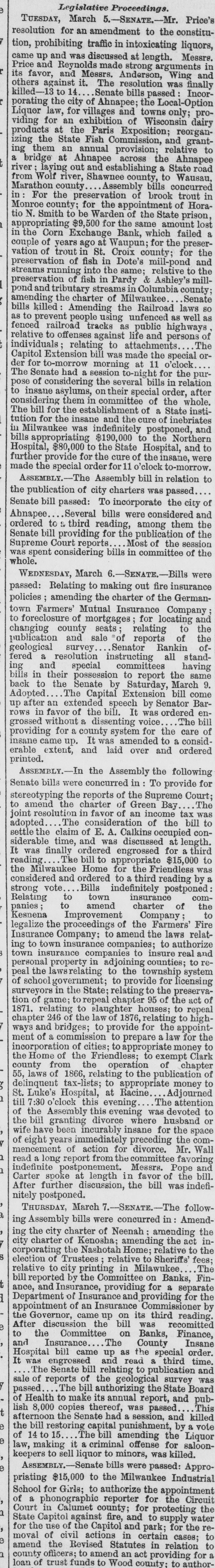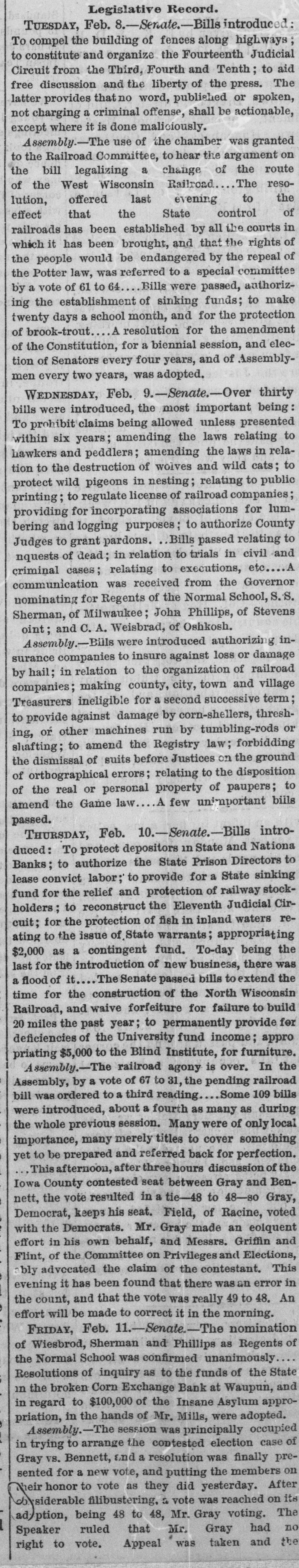 Legislative Record. TUESDAY, Feb.8.-senate.-Billsintroduced: To compel the building of fences along highways to constitute and organize the Fourteenth Judicial Circuit from the Third, Fourth and Tenth to aid free discussion and the liberty of the press. The latter provides that no word, published or spoken, not charging a criminal offense, shall be actionable, except where it is done maliciously. Assembly.-The use of the chamber was granted to the Railroad Committee, to hear the argument on the bill legalizing a change of the route of the West Wisconsin Railroad The resolution, offered last evening to the of effect that the State control railroads has been established by all the courts in which it has been brought, and that the rights of the people would be endangered by the repeal of the Potter law, was referred to a special committee by a vote of 61 to 64 Bills were passed, authorizing the establishment of sinking funds; to make twenty days a school month, and for the protection of brook-trout A resolution for the amendment of the Constitution, for a biennial session, and election of Senators every four years, and of Assemblymen every two years, was adopted. WEDNESDAY, Feb. 9.-Senate.-Over thirty bills were introduced, the most important being To prohibit claims being allowed unless presented within six years; amending the laws relating to hawkers and peddlers; amending the laws in relation to the destruction of wolves and wild cats; to protect wild pigeons in nesting; relating to public printing; to regulate license of railroad companies; providing for incorporating associations for lumbering and logging purposes; to authorize County Judges to grant pardons. Bills passed relating to nquests of dead; in relation to trials in civil and criminal cases; relating to executions, etc communication was received from the Governor nominating for Regents of the Normal School, S.S. Sherman, of Milwaukee; John Phillips, of Stevens oint; and C. A. Weisbrad, of Oshkosh. Assembly.-Bill were introduced authorizing insurance companies to insure against loss or damage by hail; in relation to the organization of railroad companies; making county, city, town and village Treasurers ineligible for a second successive term to damage by provide against corn-shellers, by tumbling-rods threshing, or other machines run or shafting; to amend the Registry law; forbidding the dismissal of suits before Justices on the ground of orthographical errors; relating to the disposition of the real or personal property of paupers; to amend the Game law A few unimportant bills passed. THURSDAY, Feb. 10.-Senate.-Bills introduced: To protect depositors in State and Nationa Banks; to authorize the State Prison Directors to lease convict labor; to provide for a State sinking fund for the relief and protection of railway stockholders; to reconstruct the Eleventh Judicial Circuit; for the protection of fish in inland waters reating to the issue of State warrants; appropriating $2,000 as a contingent fund. To-day being the last for the introduction of new business, there was a flood of it The Senate passed bills to extend the time for the construction of the North Wisconsin Railroad, and waive forfeiture for failure to build 20 miles the past year; to permanently provide for deficiencies of the University fund income: appro priating $5,000 to the Blind Institute, for furniture. the Assembly.-The railroad agony is over. In Assembly, by a vote of 67 to 31, the pending railroad Some 109 bills bill was ordered to a third reading were introduced, about a fourth as many as during the whole previous session. Many were of only local importance, many merely titles to cover something yet to be prepared and referred back for perfection. This afternoon, after three hours discussion of the Iowa County contested seat between Gray and Bennett, the vote resulted in a tie-48 to 48-80 Gray, Democrat, keep3 his seat. Field, of Racine, voted with the Democrats. Mr. Gray made an eolquent effort in his own behalf, and Messrs. Griffin and Flint, of the Committee on Privileges and Elections, bly advocated the claim of the contestant. This it has been was an in the and that vote was An evening count, the found that there really 49 to error 48. effort will be made to correct it in the morning. FRIDAY, Feb. 11.-Senate.-The nomination of Wiesbrod, Sherman and Phillips as Regents of the Normal School was confirmed unanimously Resolutions of inquiry as to the funds of the State in the broken Corn Exchange Bank at Waupun, and in regard to $100,000 of the Insane Asylum appropriation, in the hands of Mr. Mills, were adopted. Assembly.-The session was principally occupied in trying to arrange the contested election case of Gray vs. Bennett, and a resolution was finally presented for a new vote, and putting the members on Their honor to vote as they did yesterday. After its filibustering, a vote was reached on ad/ption, being 48 to 48, Mr. Gray voting. The Speaker ruled that Mr. Gray had no right to vote. Appeal was taken and the