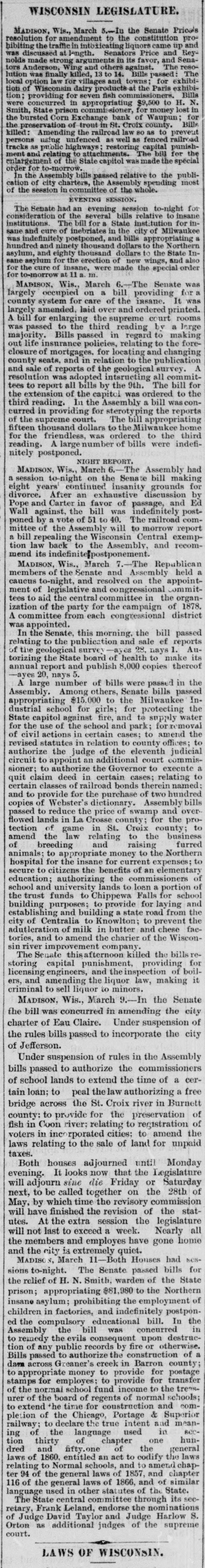 # WISCONSIN LEGISLATURE. MADISON, Wis., March 5. In the Senate Price's resolution for amendment to the constitution prohibiting the traffle in intoxicating liquors came up and was discussed at length. Senators Price and Reynolds made strong arguments in its favor, and Senators Anderson, Wing and others against. The resolution was finally killed, 13 to 14. Bills passed: The local option law for villages and towns; for exhibition of Wisconsin dairy products at the Paris exhibition; providing for seven fish commissioners. Bills were concurred in appropriating $9,500 to H. N. Smith, State prison commissioner, for money lost in the bursted Corn Exchange bank of Waupun; for the preservation of trout in St. Croix county. Bills killed: Amending the railroad law so as to prevent persons using unfenced as well as fenced railroad tracks as public highways; restoring capital punishment and relating to attachments. The bill for the enlargement of the State capitol was made the spécial order for to-morrow. In the Assembly bills passed relative to the publication of city charters, the Assembly spending most of the session in committee of the whole. EVENING SESSION. The Senate had an evening session to-night for consideration of the several bills relative to insane institutions. The bill for a State institution for insane and cure of inebriates in the city of Milwaukee was indefinitely postponed, and bills appropriating a hundred and ninety thousand dollars to the Northern asylum, and eighty thousand dollars to the State Insane asylum for the erection of new wings, and also for the cure of insane, were made the special order for to-morrow at 11 a. m. MADISON, Wis., March 6. The Senate was largely occupied on a bill providing for a county system for care of the insane. It was largely amended, laid over and ordered printed. A bill for enlarging the supreme court rooms was passed to the third reading by a large majority. Bills passed in regard to making out life insurance policies, relating to the foreclosure of mortgages, for locating and changing county seats, and in relation to the publication and sale of reports of the geological survey. A resolution was adopted intsructing all committees to report all bills by the 9th. The bill for the extension of the capitol was ordered to the third reading. In the Assembly a bill was concurred in providing for sterotyping the reports of the supreme court. The bill appropriating fifteen thousand dollars to the Milwaukee home for the friendless, was ordered to the third reading. A large number of bills were indefinitely postponed. NIGHT REPORT. MADISON, Wis., March 6. The Assembly had a session to-night on the Senate bill making eight years' continued insanity grounds for divorce. After an exhaustive discussion by Pope and Carter in favor of passage, and Ed Wall against, the bill was indefinitely postponed by a vote of 51 to 40. The railroad committee of the Assembly will to morrow report a bill repealing the Wisconsin Central exemption law back to the Assembly, and recommend its indefinite postponement. MADISON, Wis., March 7. The Republican members of the Senate and Assembly held a caucus to-night, and resolved on the appointment of legislative and congressional committees to aid the central committee in the organization of the party for the campaign of 1878. A committee from each congressional district was appointed. In the Senate, this morning, the bill passed relating to the publication and sale ef reports of the geological survey -ayes 28, nays 1. Authorizing the State board of health to make its annual report and publish 8,000 copies thereof -ayes 20, nays 5. A large number of bills were passed in the Assembly. Among others, Senate bills passed appropriating $15,000 to the Milwaukee Industrial school for girls; for protecting the State capitol against fire, and to supply water for the use of the school and park; for removal of civil actions in certain cases; to amend the revised statutes in relation to county offices; to authorize the judge of the eleventh judicial circuit to appoint an additional court commissioner; to authorize the Governor to execute a quit claim deed in certain cases; relating to certain classes of railroad bonds therein named; and to provide for the purchase of two hundred copies of Webster's dictionary. Assembly bills passed to reduce the price of swamp and overflowed lands in La Crosse county; for the protection of game in St. Croix county; to amend the law relating to the business of breeding and raising furred animals; to appropriate money to the Northern hospital for the insane for current expenses; to secure to citizens the benefits of an elementary education; authorizing the commissioners of school and university lands to loan a portion of the trust funds to Chippewa Falls for school building purposes; to provide for laying and establishing and building a state road from the city of Centralia to Knowlton; to prevent the adulteration of milk in butter and chese factories, and to amend the charier of the Wisconsin river improvement company. The Senate this afternoon killed the bills restoring capital punishment, providing for licensing engineers, and the inspection of boilers, and amending the liquor law, making it criminal to sell liquor to minors. MADISON, Wis., March 9. In the Senate the bill was concurred in amending the city charter of Eau Claire. Under suspension of the rules bills passed to incorporate the city of Jefferson. Under suspension of rules in the Assembly bills passed to authorize the commissioners of school lands to extend the time of a certain loan: to peal the law authorizing a free bridge across the St. Croix river in Burnett county: to provide for the preservation of fish in Coon river; relating to registration of voters in incorporated cities; to amend the laws relating to the sale of land for unpaid taxes. Both houses adjourned until Monday evening. It looks now that the Legislature will adjourn sine die Fri