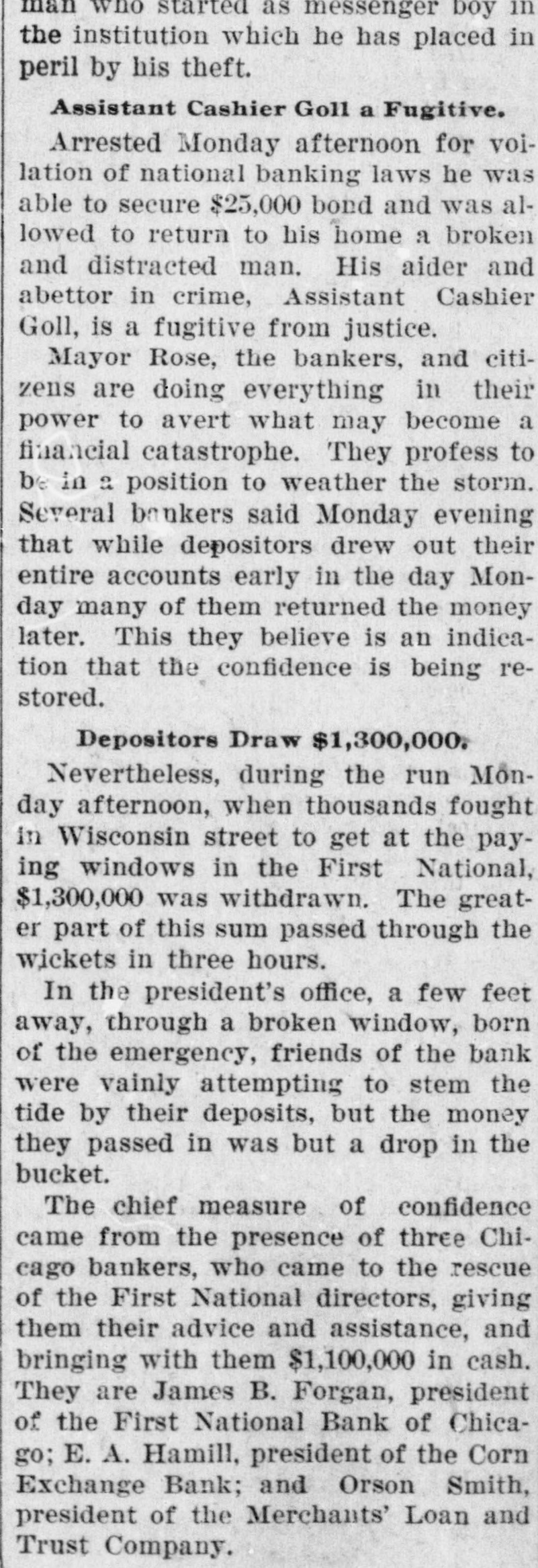 who started as messenger boy in the institution which he has placed in peril by his theft. Assistant Cashier Goll a Fugitive. Arrested Monday afternoon for voilation of national banking laws he was able to secure $25,000 bond and was allowed to return to his home a broken and distracted man. His aider and abettor in crime, Assistant Cashier Goll, is a fugitive from justice. Mayor Rose, the bankers, and citizens are doing everything in their power to avert what may become a financial catastrophe. They profess to be in a position to weather the storm. Several bankers said Monday evening that while depositors drew out their entire accounts early in the day Monday many of them returned the money later. This they believe is an indication that the confidence is being restored. Depositors Draw $1,300,000. Nevertheless, during the run Monday afternoon, when thousands fought in Wisconsin street to get at the paying windows in the First National, $1,300,000 was withdrawn. The greater part of this sum passed through the wickets in three hours. In the president's office, a few feet away, through a broken window, born of the emergency, friends of the bank were vainly attempting to stem the tide by their deposits, but the money they passed in was but a drop in the bucket. The chief measure of confidence came from the presence of three Chicago bankers, who came to the rescue of the First National directors, giving them their advice and assistance, and bringing with them $1,100,000 in cash. They are James B. Forgan, president of the First National Bank of Chicago; E. A. Hamill, president of the Corn Exchange Bank; and Orson Smith, president of the Merchants' Loan and Trust Company.