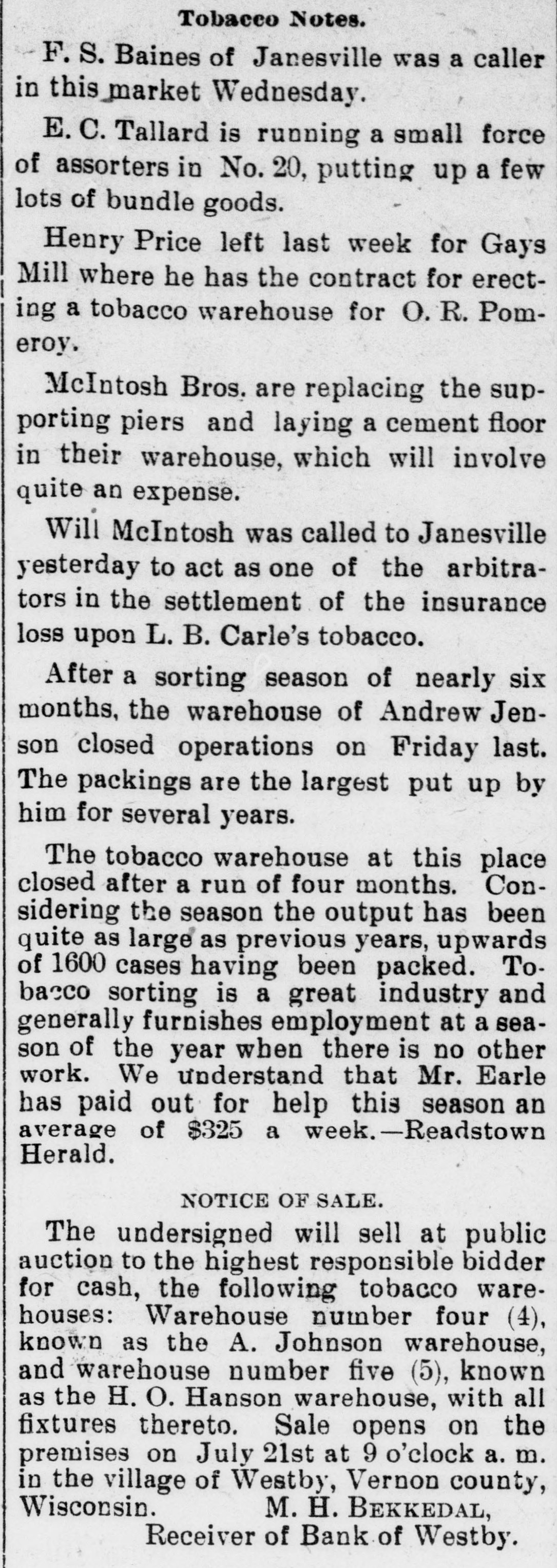 Tobacco Notes. F. S. Baines of Janesville was a caller in this market Wednesday. E. C. Tallard is running a small force of assorters in No. 20, putting up a few lots of bundle goods. Henry Price left last week for Gays Mill where he has the contract for erecting a tobacco warehouse for O. R. Pomeroy. McIntosh Bros. are replacing the supporting piers and laying a cement floor in their warehouse, which will involve quite an expense. Will McIntosh was called to Janesville yesterday to act as one of the arbitrators in the settlement of the insurance loss upon L. B. Carle's tobacco. After a sorting season of nearly six months, the warehouse of Andrew Jenson closed operations on Friday last. The packings are the largest put up by him for several years. The tobacco warehouse at this place closed after a run of four months. Considering the season the output has been quite as large as previous years, upwards of 1600 cases having been packed. Tobacco sorting is a great industry and generally furnishes employment at a season of the year when there is no other work. We understand that Mr. Earle has paid out for help this season an average of $325 a week.-Readstown Herald. NOTICE OF SALE. The undersigned will sell at public auction to the highest responsible bidder for cash, the following tobacco warehouses: Warehouse number four (4), known as the A. Johnson warehouse, and warehouse number five (5), known as the H. O. Hanson warehouse, with all fixtures thereto. Sale opens on the premises on July 21st at 9 o'clock a. m. in the village of Westby, Vernon county, Wisconsin. M. H. BEKKEDAL, Receiver of Bank of Westby.