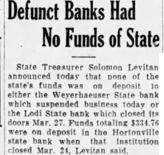 Defunct Banks Had No Funds of State State Treasurer Solomon Levitan announced today that none of the state's funds deposit either the Weyerhaeuser State bank which business today the Lodi State bank which closed its doors Mar Funds $334 on deposit in the state bank when that institution closed Mar. 24, Levitan said.