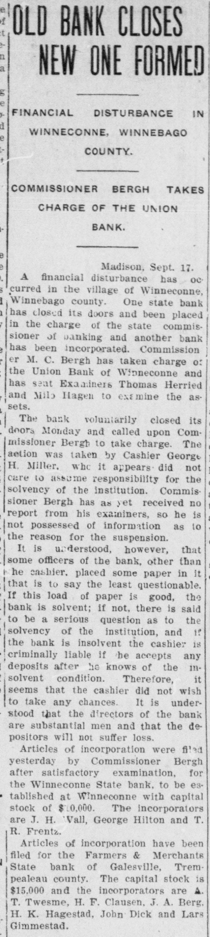 OLD BANK CLOSES a NEW ONE FORMED FINANCIAL DISTURBANCE IN WINNECONNE, WINNEBAGO COUNTY. COMMISSIONER BERGH TAKES CHARGE OF THE UNION BANK. Madison, Sept. 17. A financial disturbance has oc curred in the village of Winneconne, Winnebago county. One state bank has closed its doors and been placed in the charge of the state commissioner of banking and another bank has been incorporated. Commission er M. C. Bergh has taken charge o: the Union Bank of Winneconne and has sent Examiners Thomas Herried and Milo Hagen to examine the assets. The bank voluntarily closed its doors Monday and called upon Commissioner Bergh to take charge. The action was taken by Cashier George H. Miller. who it appears did not care 10 assume responsibility for the solvency of the institution. Commissioner Bergh has as yet received no report from his examiners, so he is not possessed of information as to the reason for the suspension. It is understood, however, that some officers of the bank, other than he cashier. placed some paper in it that is to say the least questionable. If this load of paper is good, the bank is solvent; if not, there is said to be a serious question as to the solvency of the institution, and if the bank is insolvent the cashier is criminally liable if he accepts any deposits after he knows of the insolvent condition. Therefore, it seems that the cashier did not wish to take any chances. It is understood that the directors of the bank are substantial men and that the depositors will not suffer loss. Articles of incorporation were filed yesterday by Commissioner Bergh after satisfactory examination, for the Winneconne State bank, to be established at Winneconne with capital stock of $10,000. The incorporators are J. H. Wall, George Hilton and T. R. Frentz. Articles of incorporation have been filed for the Farmers & Merchants State bank of Galesville, Trempealeau county. The capital stock is $15,000 and the incorporators are A. T. Twesme, H. F. Clausen, J. A. Berg. H. K. Hagestad, John Dick and Lars Gimmestad.