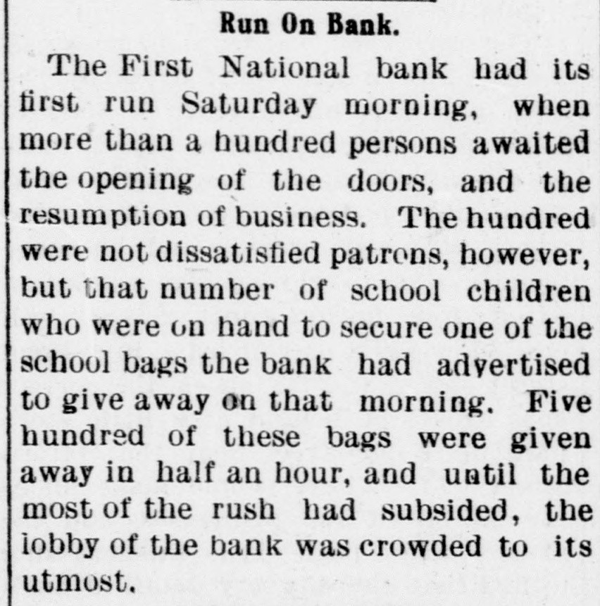 Run On Bank. The First National bank had its first run Saturday morning, when more than a hundred persons awaited the opening of the doors, and the resumption of business. The hundred were not dissatisfied patrons, however, but that number of school children who were on hand to secure one of the school bags the bank had advertised to give away on that morning. Five hundred of these bags were given away in half an hour, and until the most of the rush had subsided, the lobby of the bank was crowded to its utmost.