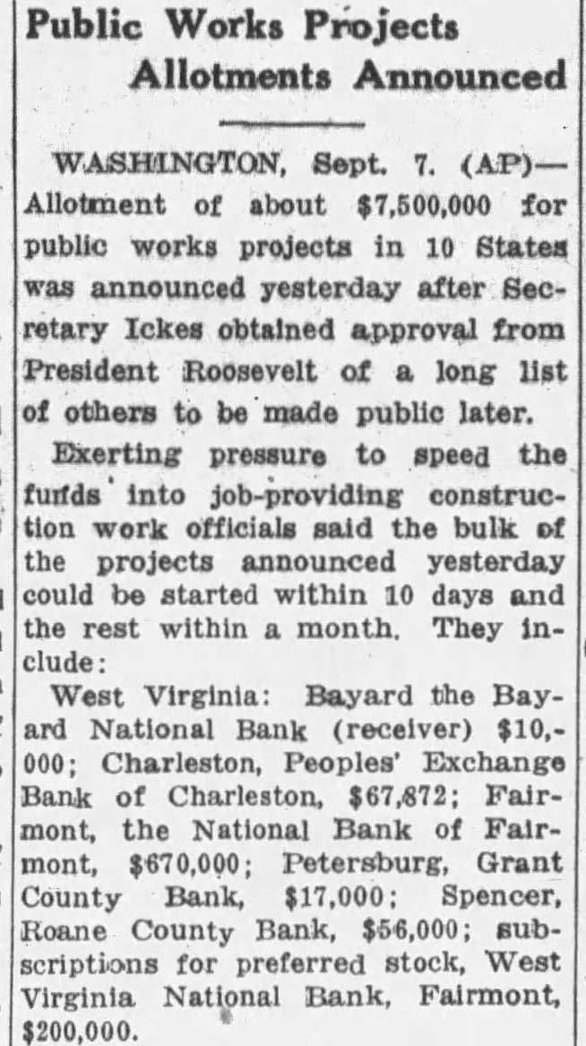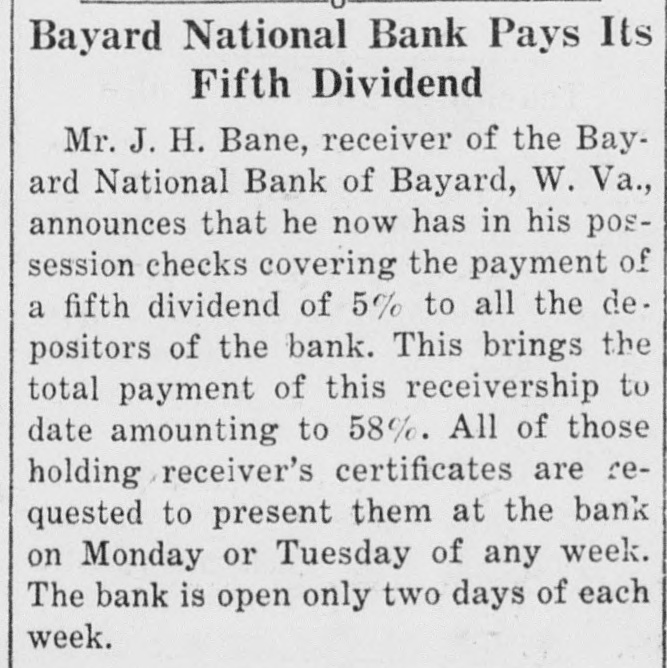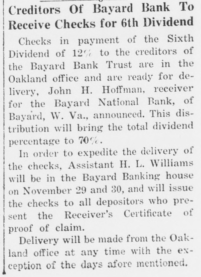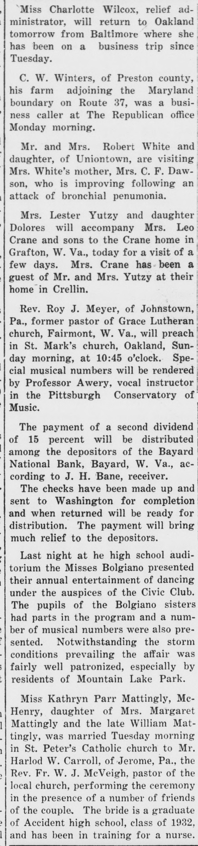 Miss Charlotte Wilcox, relief administrator, will return to Oakland tomorrow from Baltimore where she has been on a business trip since Tuesday. C. W. Winters, of Preston county, his farm adjoining the Maryland boundary on Route 37, was a business caller at The Republican office Monday morning. Mr. and Mrs. Robert White and daughter, of Uniontown, are visiting Mrs. White's mother, Mrs. C. F. Dawson, who is improving following an attack of bronchial penumonia. Mrs. Lester Yutzy and daughter Dolores will accompany Mrs. Leo Crane and sons to the Crane home in Grafton, W. Va., today for a visit of a few days. Mrs. Crane has been a guest of Mr. and Mrs. Yutzy at their home in Crellin. Rev. Roy J. Meyer, of Johnstown, Pa., former pastor of Grace Lutheran church, Fairmont, W. Va., will preach in St. Mark's church, Oakland, Sunday morning, at 10:45 o'clock. Special musical numbers will be rendered by Professor Awery, vocal instructor in the Pittsburgh Conservatory of Music. The payment of a second dividend of 15 percent will be distributed among the depositors of the Bayard National Bank, Bayard, W. Va., according to J. H. Bane, receiver. The checks have been made up and sent to Washington for completion and when returned will be ready for distribution. The payment will bring much relief to the depositors. Last night at he high school auditorium the Misses Bolgiano presented their annual entertainment of dancing under the auspices of the Civic Club. The pupils of the Bolgiano sisters had parts in the program and a number of musical numbers were also presented. Notwithstanding the storm conditions prevailing the affair was fairly well patronized, especially by residents of Mountain Lake Park. Miss Kathryn Parr Mattingly, McHenry, daughter of Mrs. Margaret Mattingly and the late William Mattingly, was married Tuesday morning in St. Peter's Catholic church to Mr. Harlod W. Carroll, of Jerome, Pa., the Rev. Fr. W. J. McVeigh, pastor of the local church, performing the ceremony in the presence of a number of friends of the couple. The bride is a graduate of Accident high school, class of 1932, and has been in training for a nurse.