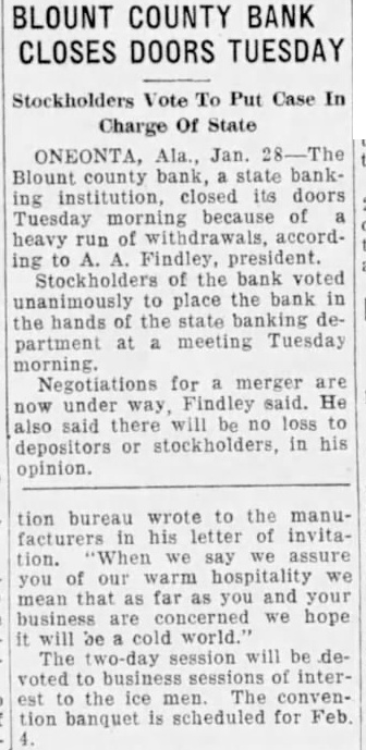 BLOUNT COUNTY BANK CLOSES DOORS TUESDAY Stockholders Vote To Put Case In Charge Of State ONEONTA, Ala., Jan. 28-The Blount county bank, state banking institution, closed its doors Tuesday because of heavy run of withdrawals, according to A. Findley, president. the bank voted unanimously to place the bank in the hands the state banking department at meeting Tuesday morning. Negotiations for merger now under Findley said. He also said there will be no loss to depositors or stockholders, in his opinion. tion bureau wrote the manufacturers his letter of invitation. When we assure you of our hospitality we mean that far as you and your business are concerned we hope it will be cold world.' The two-day will be devoted to business of interest to the ice men. The convention banquet is scheduled for Feb. 4.